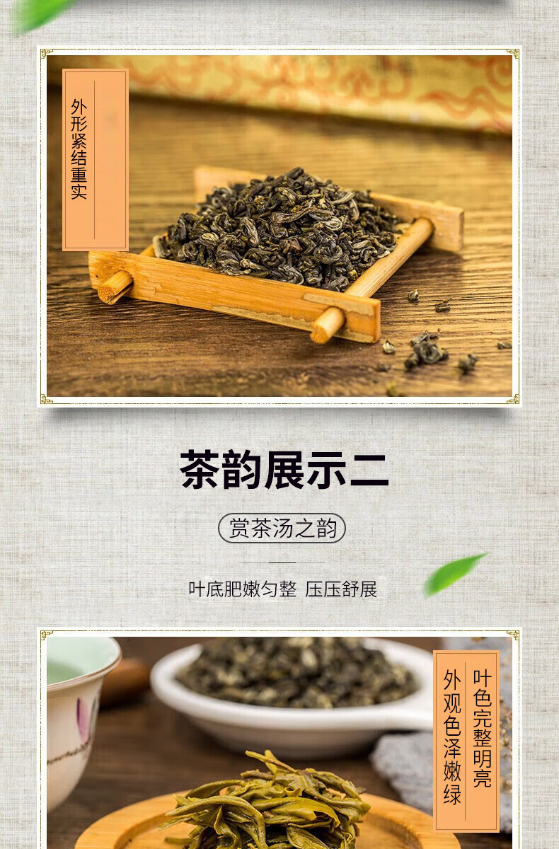 外形紧结重实,卷曲成螺,有白毫,色泽银绒素裹,黄绿油润