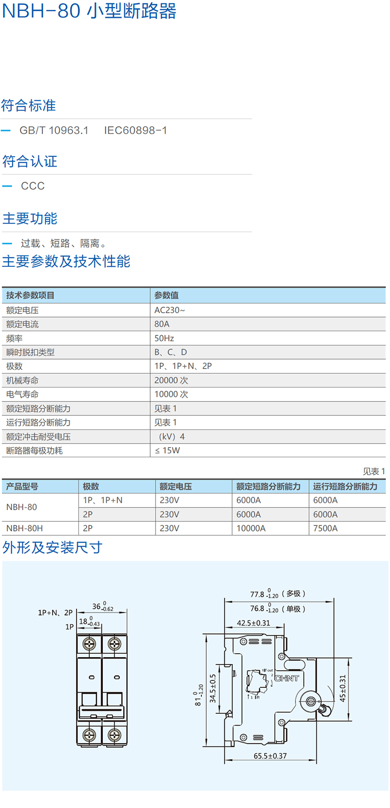 正泰 电器小型断路器 NBH-80 2P C80 单位:个