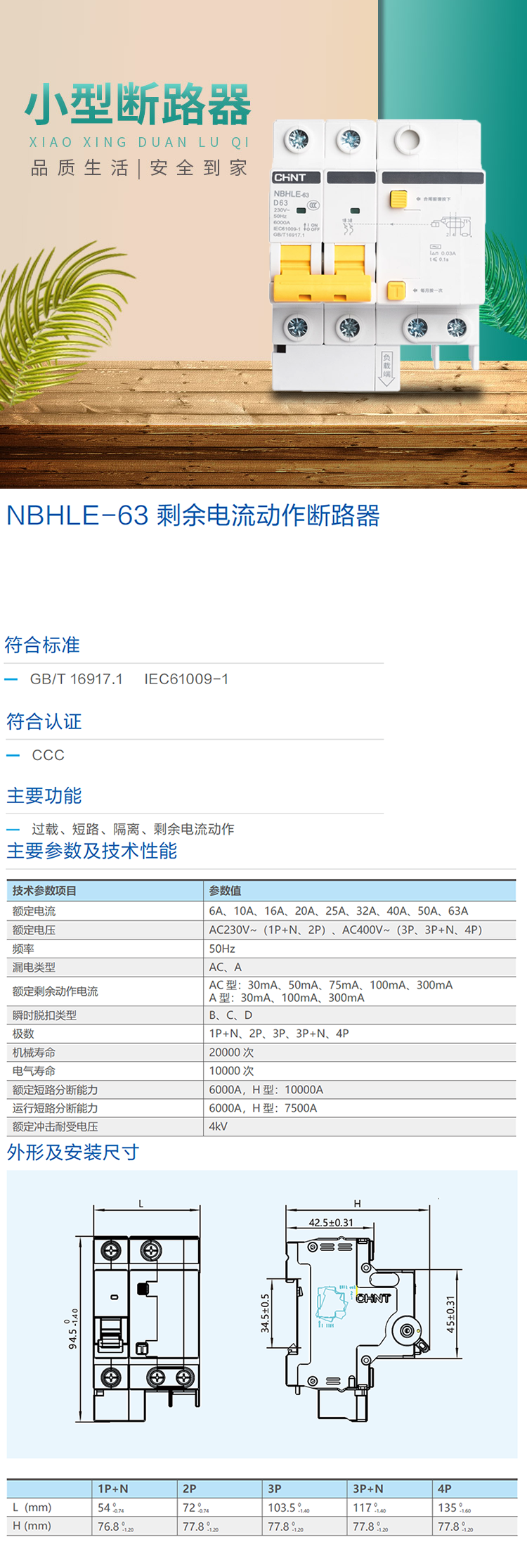 正泰 电器小型断路器 NBHLE-63 2P D63 30mA 单位:个