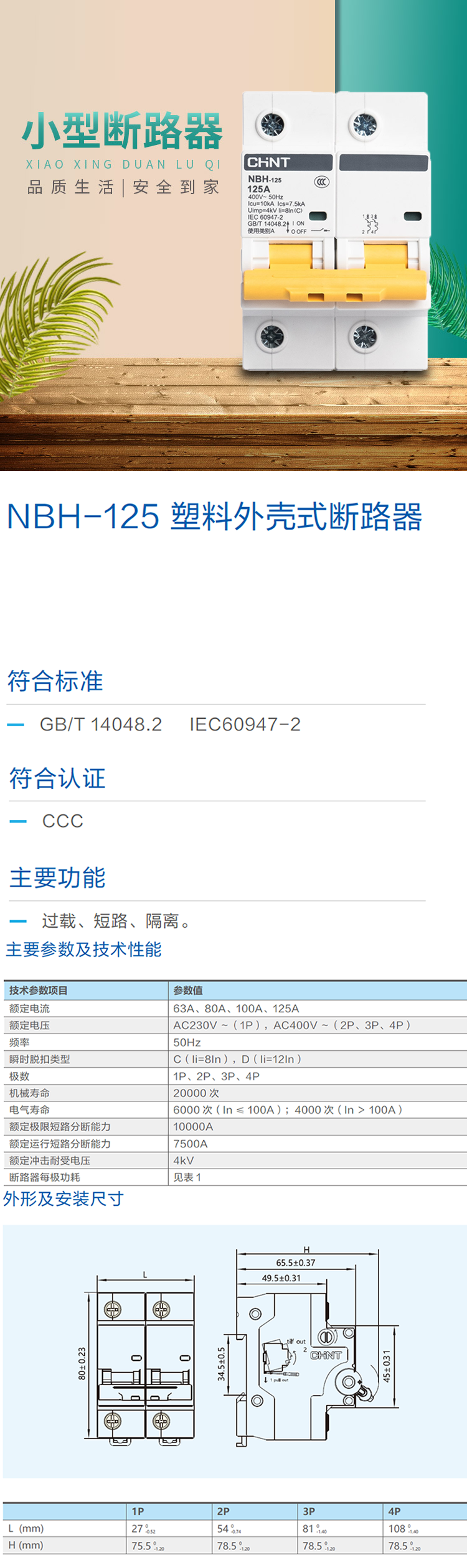 正泰 电器小型断路器 NBH-125 2P C125A 单位:个