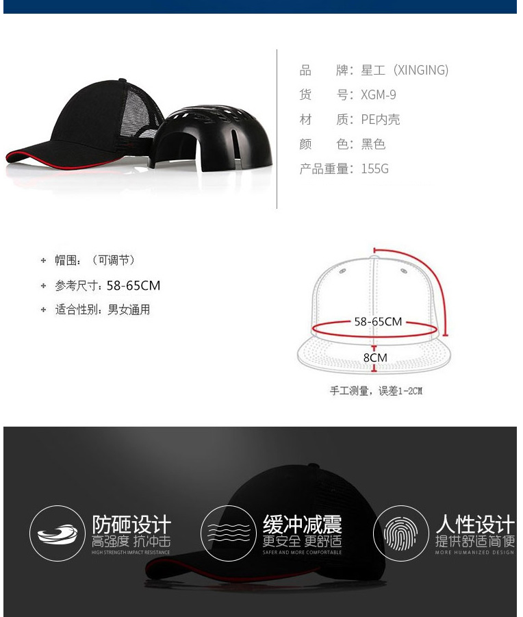 星工(XINGONG)鸭舌帽 车间防碰撞工作帽遮阳安全防护帽可绣字定制运动型防撞帽 透气款 藏青色 5个起订