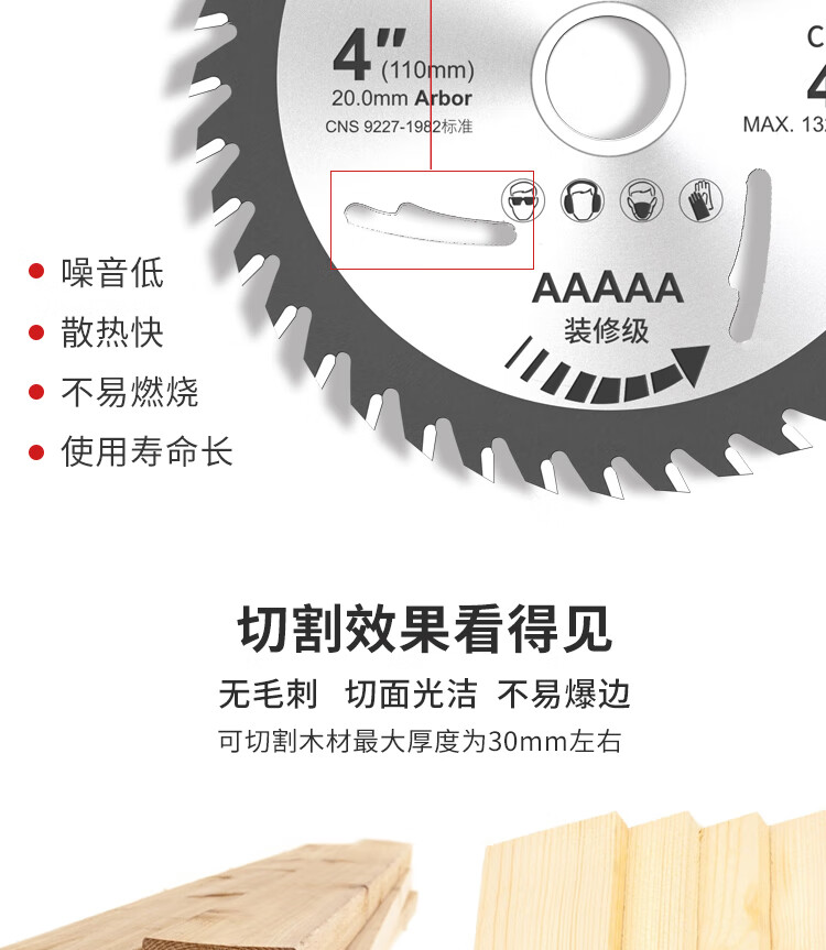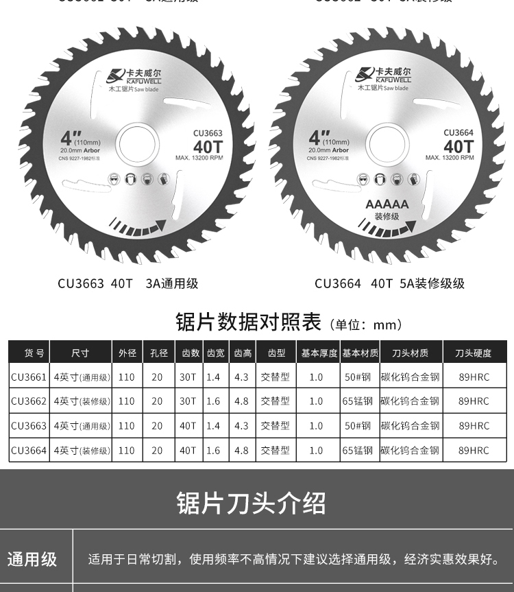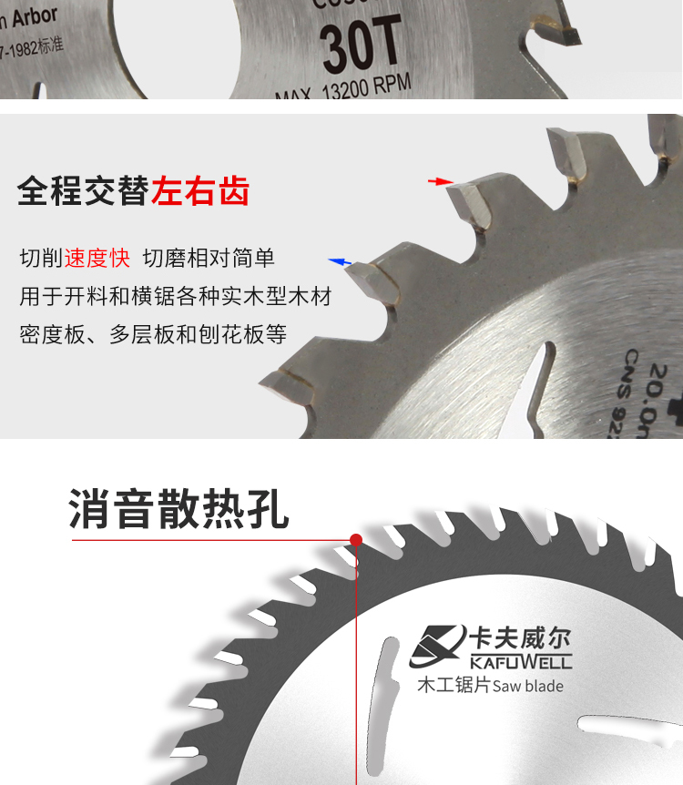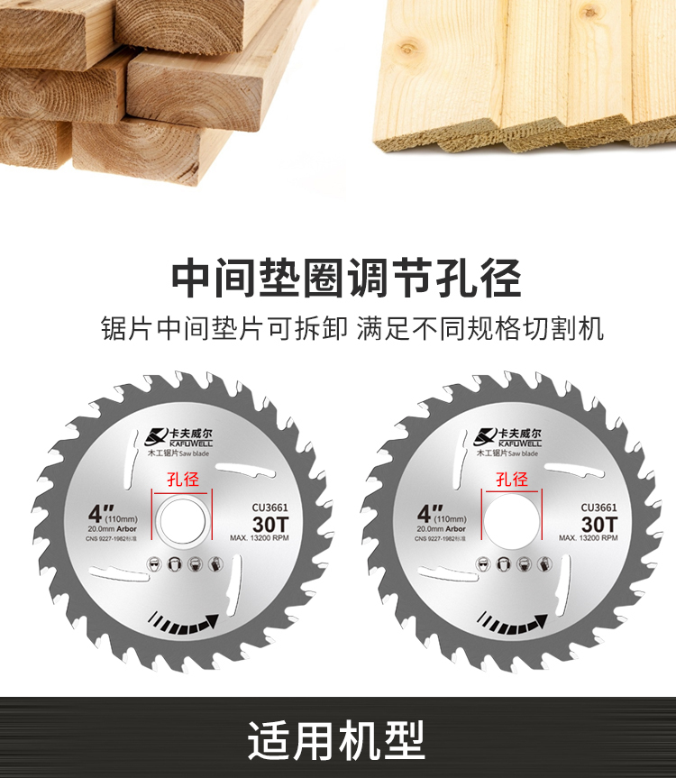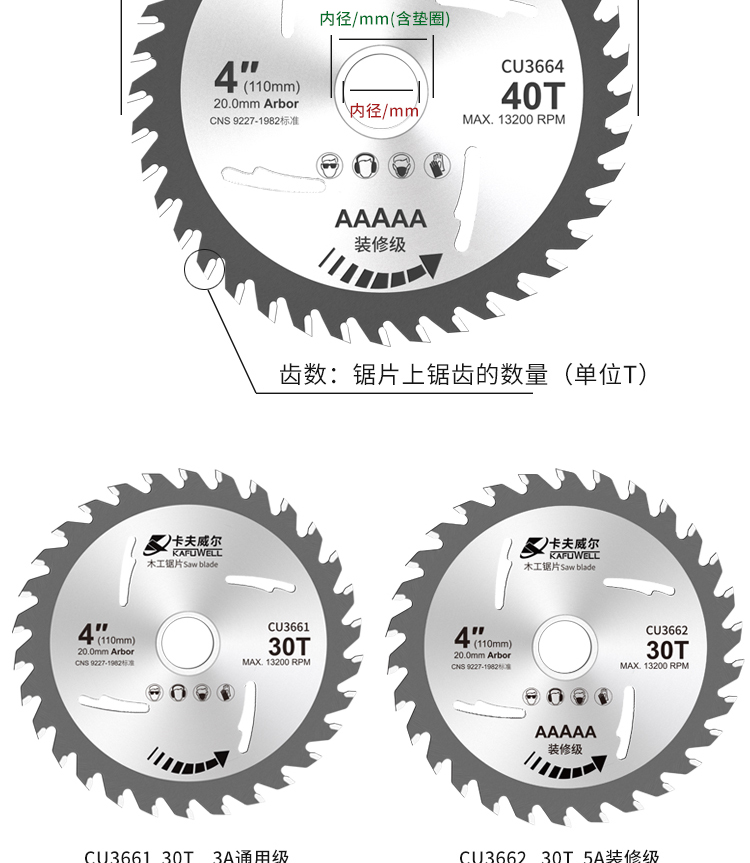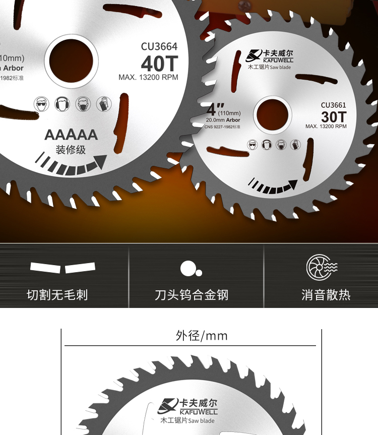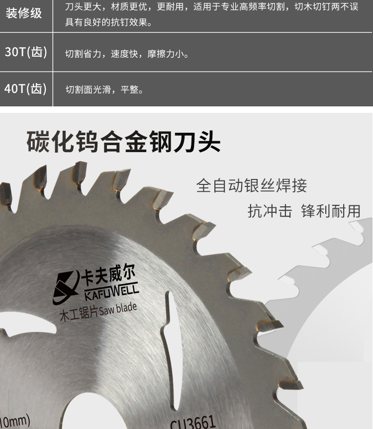 卡夫威尔 角磨机切割片木工锯片 合金圆锯片 台锯电圆锯无尘锯机适用30齿 1片装 CU3662 10片起订