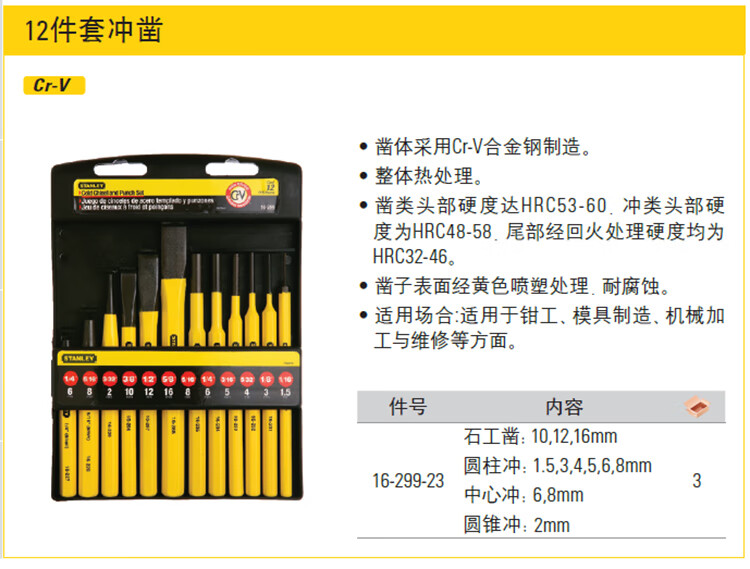 史丹利STANLEY 12件套冲凿 扁凿 尖凿手工水泥凿刀凿子钢冲扁头錾子 16-299-23