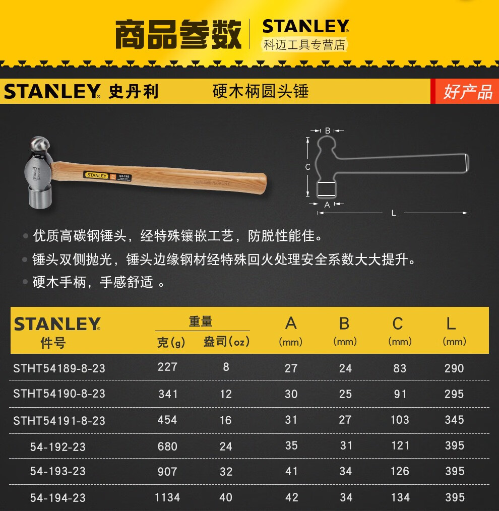 史丹利(Stanley)圆头锤子木柄铁锤子 木工家用铁榔头工具 32oz(锤头重907g)54-193-23