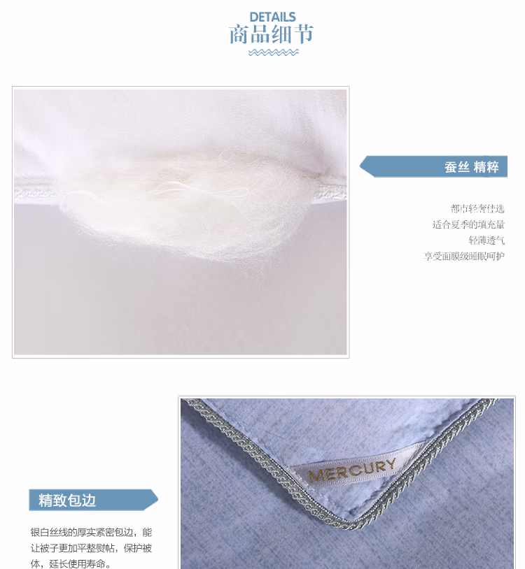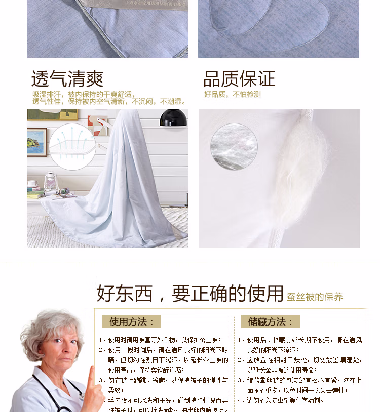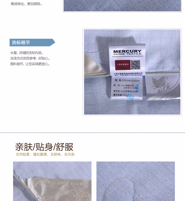 | 商品品牌水星商品名称DH莘德拉蚕丝被商品货号114345商品规格200*230cm质量标准GB 18401 B类商品重量200*230cm:填充物重:300g 产品净重:1200g 产品毛重:1300g所有产品均为抽样检测,存在一定误差,具体以收到实物为准成分含量面料:100%聚酯纤维填充物:100%柞蚕丝商品明细被子*1 精美包装*1 |