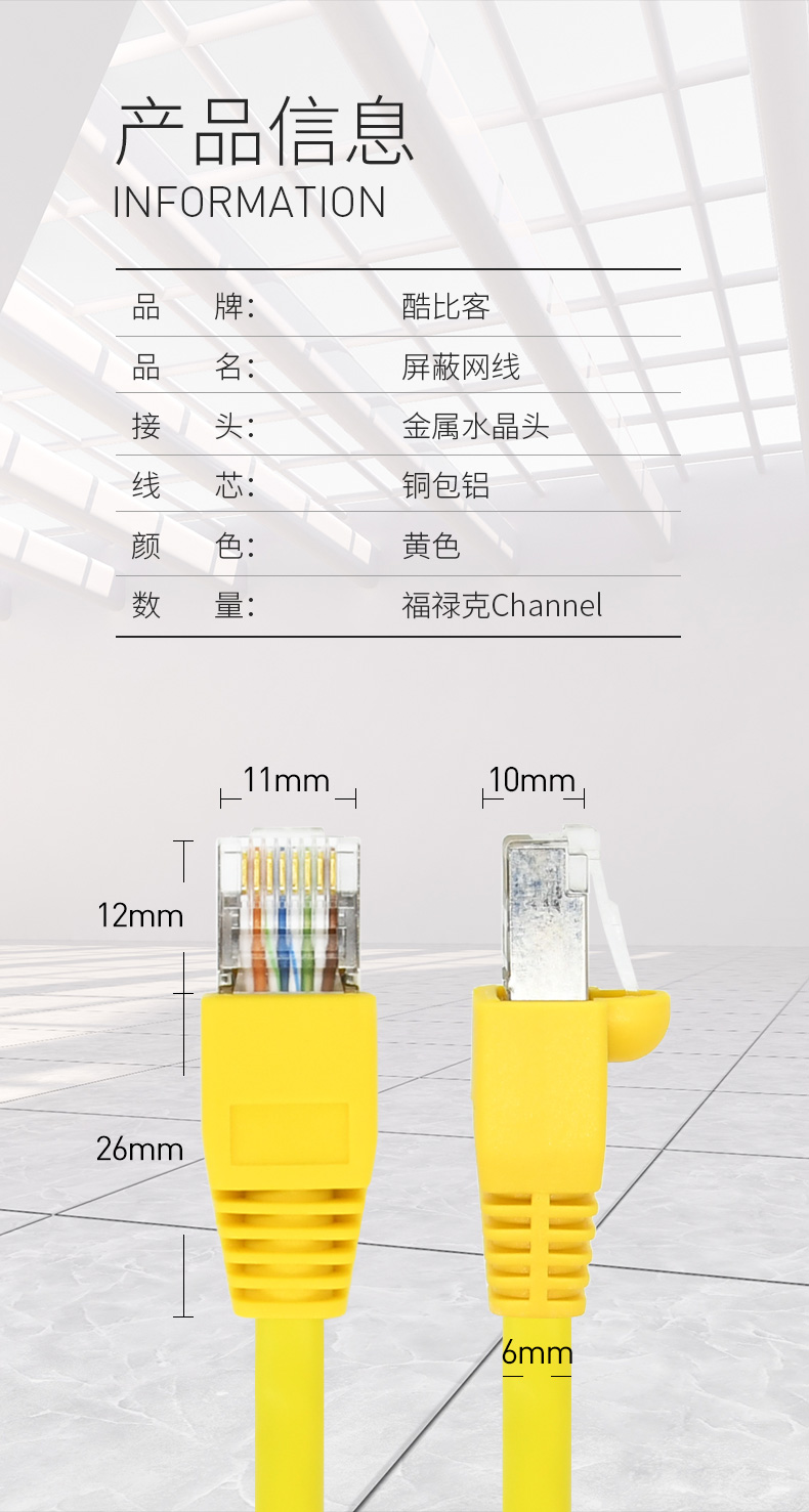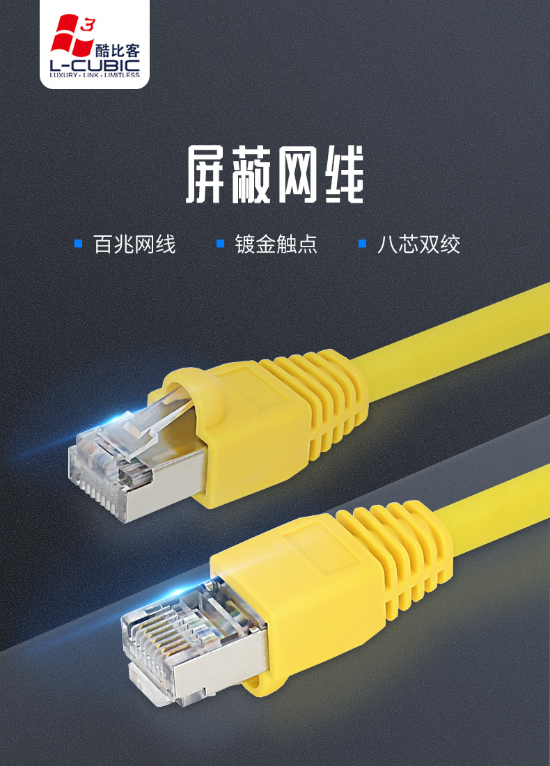 酷比客/L-CUBIC cat5e 屏蔽纯铜家用高速超五类网络跳线屏蔽百兆网线 黄色 3米