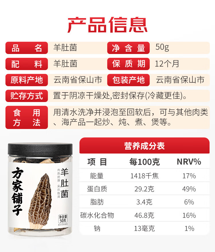 方家铺子 羊肚菌50g(5-7cm)山珍菌菇干货