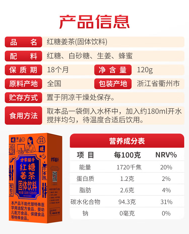 方家铺子 红糖姜茶120g 速溶姜丝茶(12g*10袋)