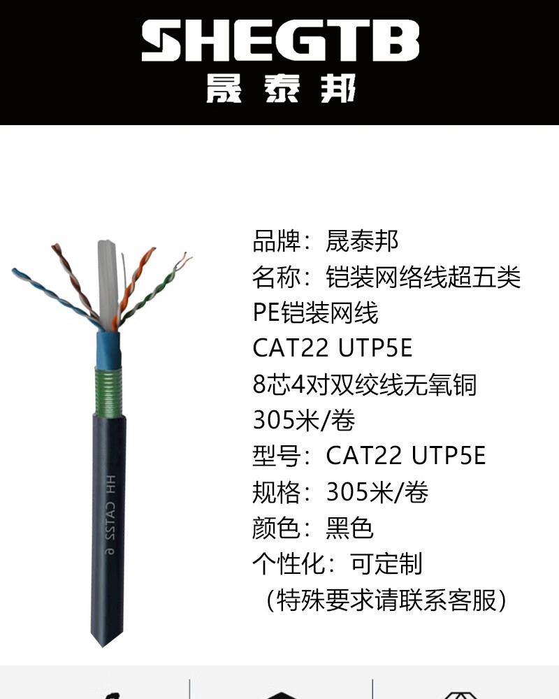 晟泰邦 铠装网络线超五类PE铠装网线 CAT22 UTP5E 8芯4对双绞线无氧铜 305米/卷