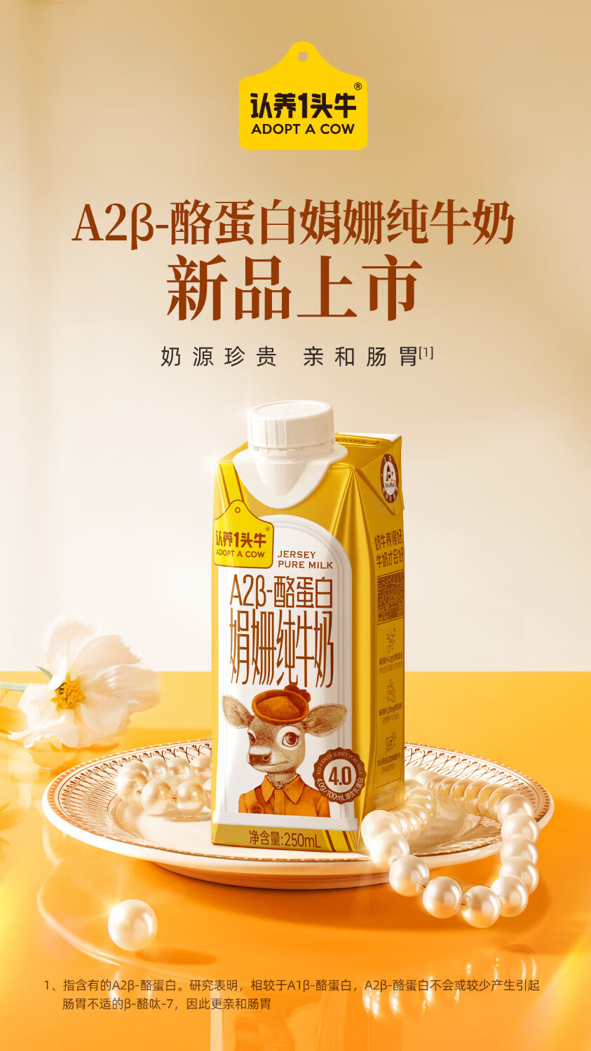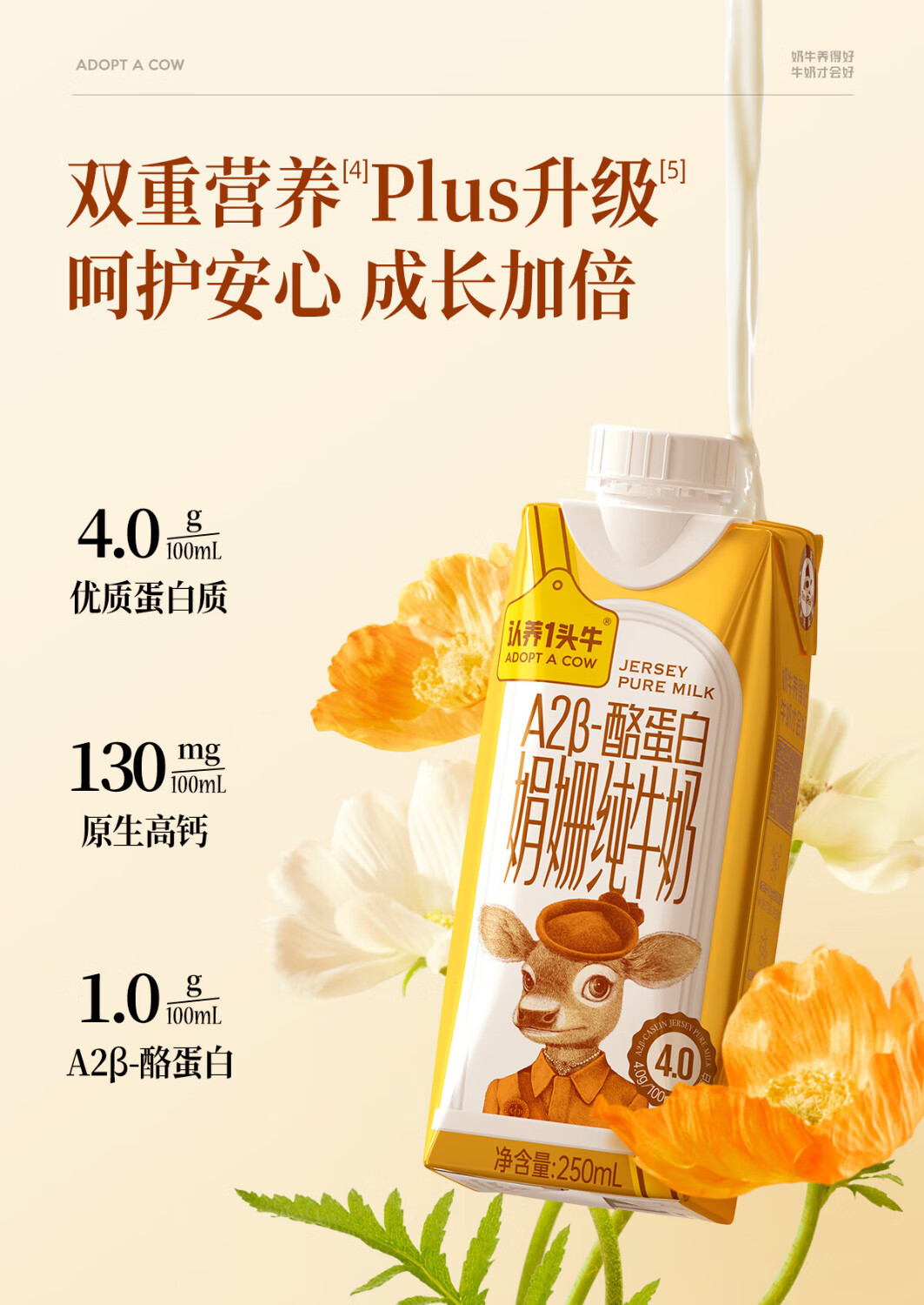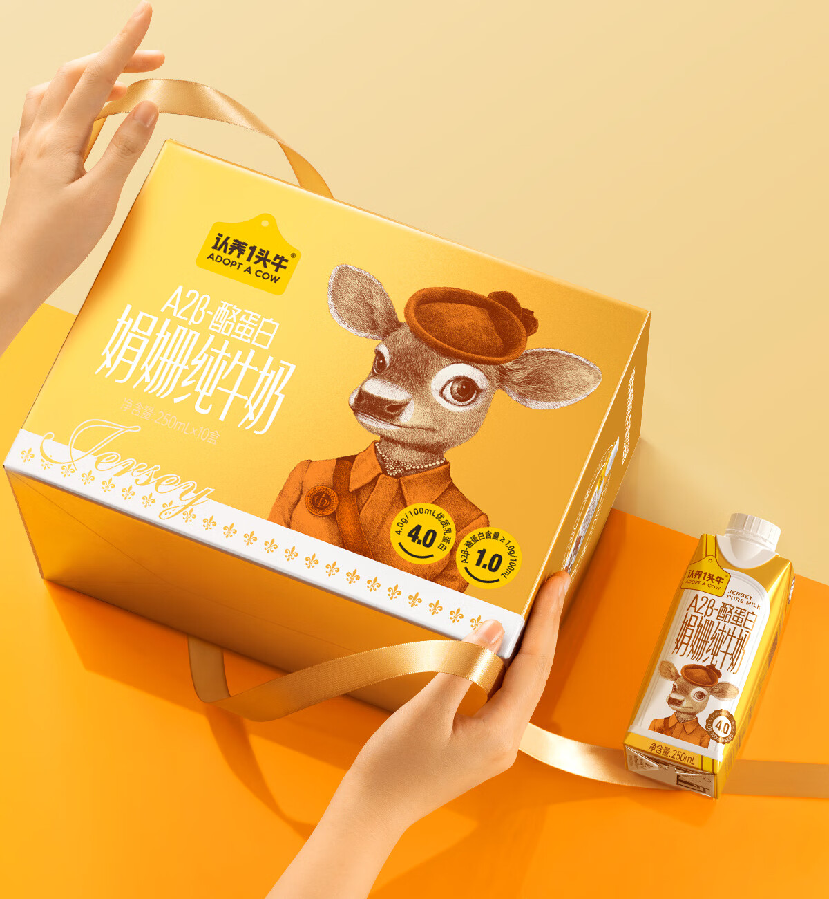 认养一头牛 A2β酪蛋白娟姗4.0g蛋白 250ml纯牛奶小金瓶营养学生奶 250ml*10盒*1箱