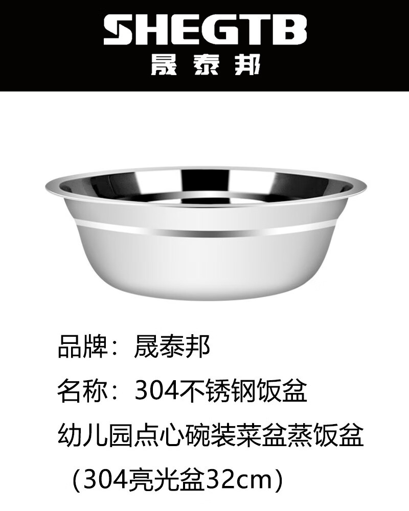 晟泰邦 304不锈钢汤盆饭盆幼儿园点心碗家用装菜盆蒸饭盆(304亮光盆(32cm))1个 5个起订