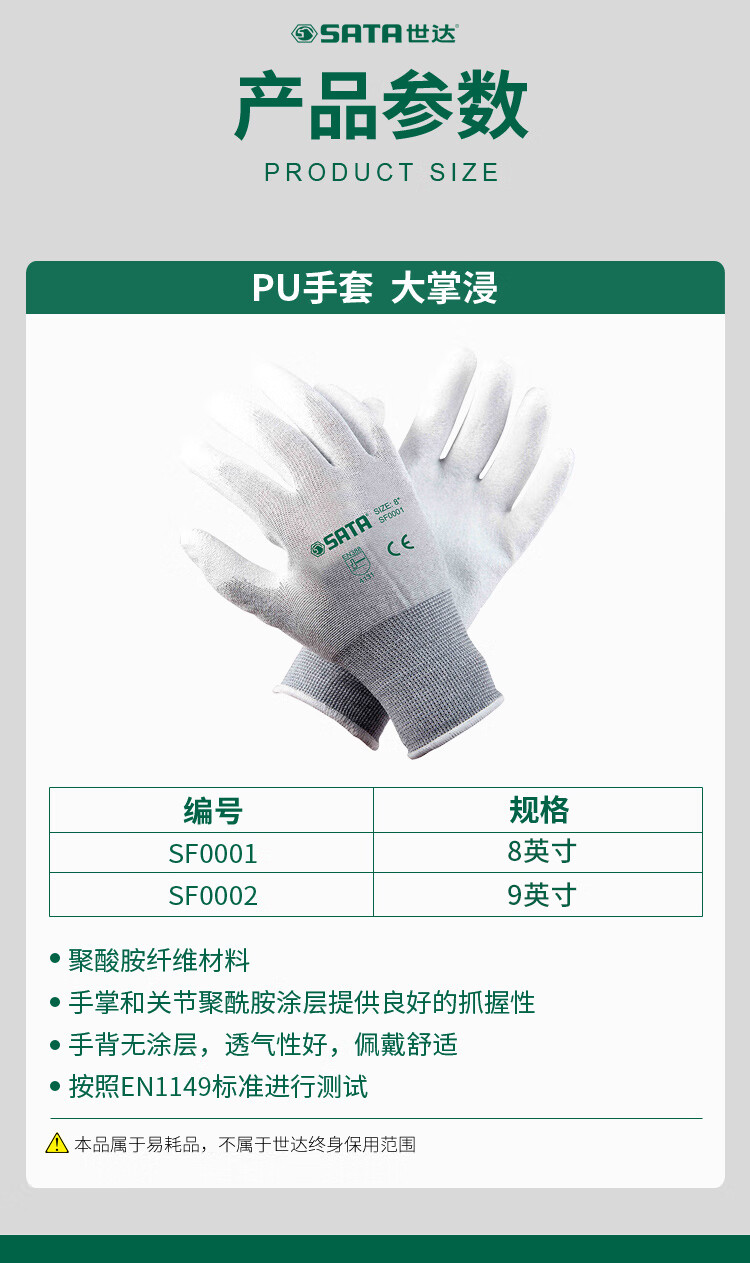 世达 SATA SF0001 手套(大掌浸) 8寸 单位:双