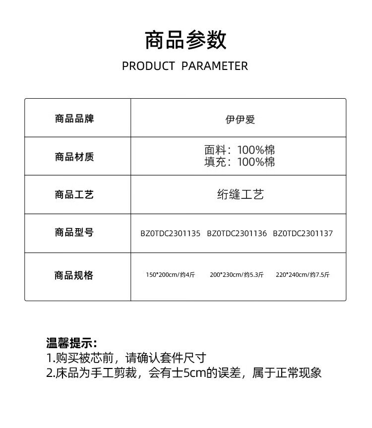 伊伊爱 全棉水洗提花新疆棉花秋冬被 白220*240cmBZ0TDC2301137总重7.5斤
