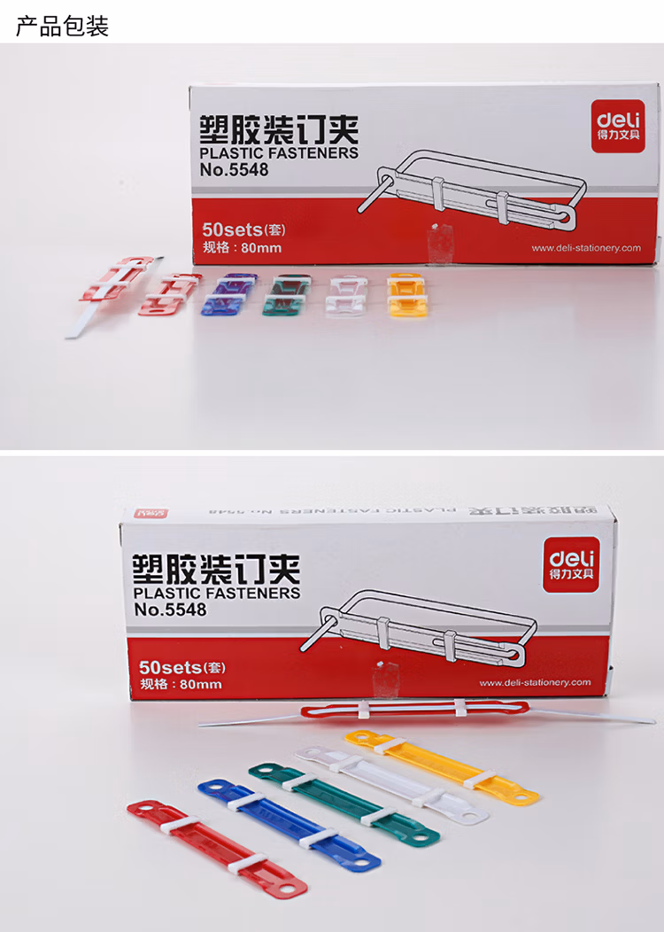 得力5548塑胶装订夹80MM(混)(50套/盒)