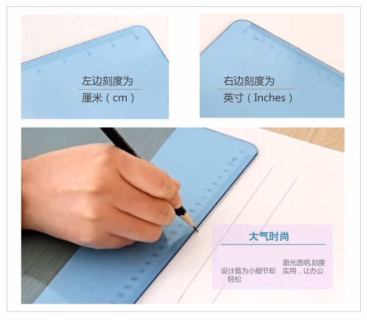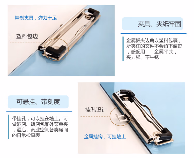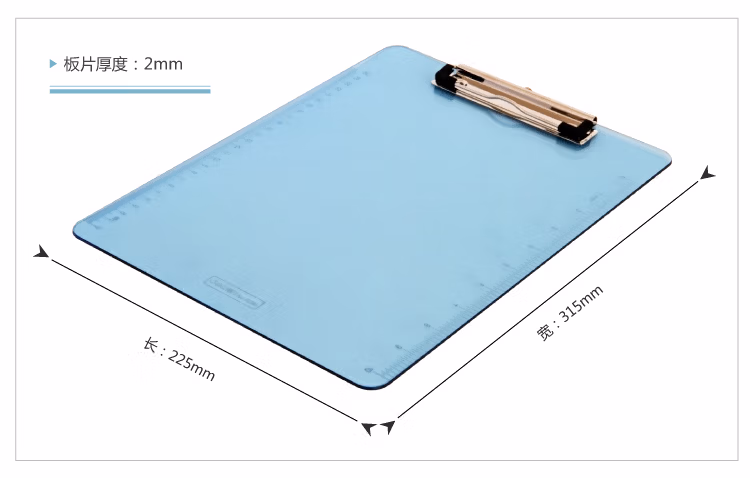 采用正料制作,加厚板体,牢固耐用;板面半透明,轻盈而有现代,感配用金属平夹,夹力强、不生锈!