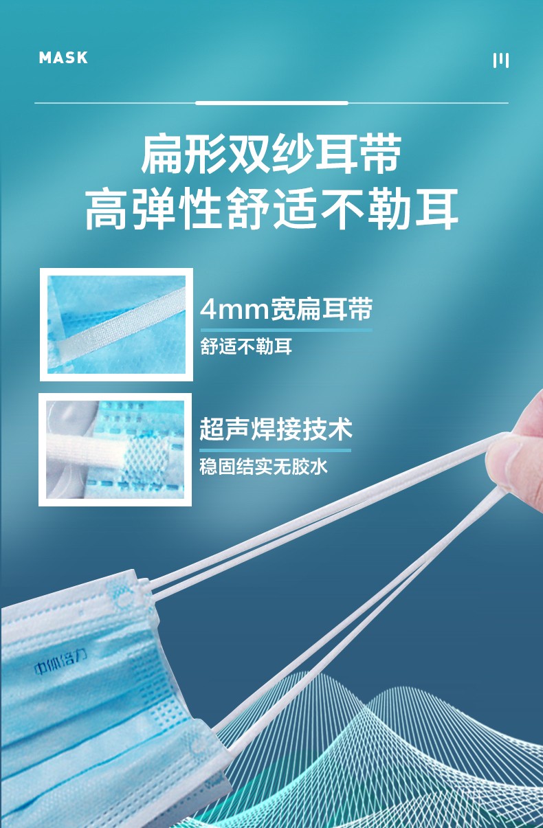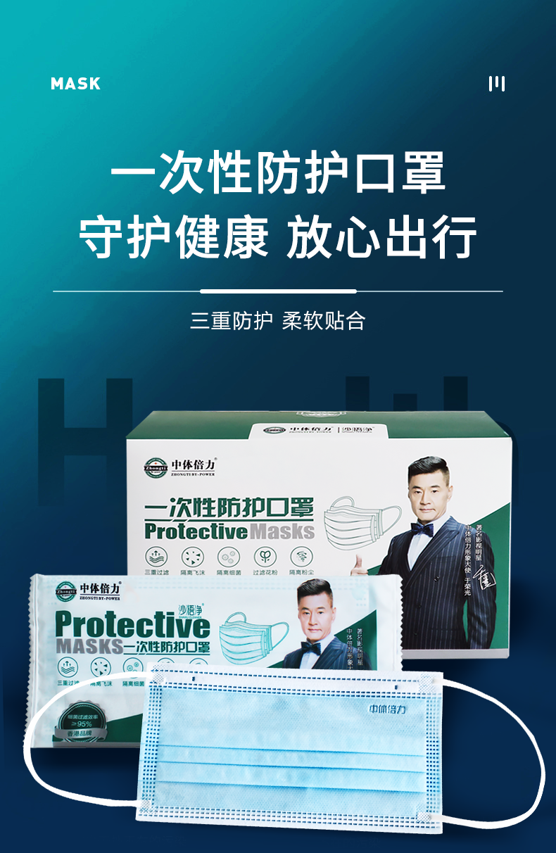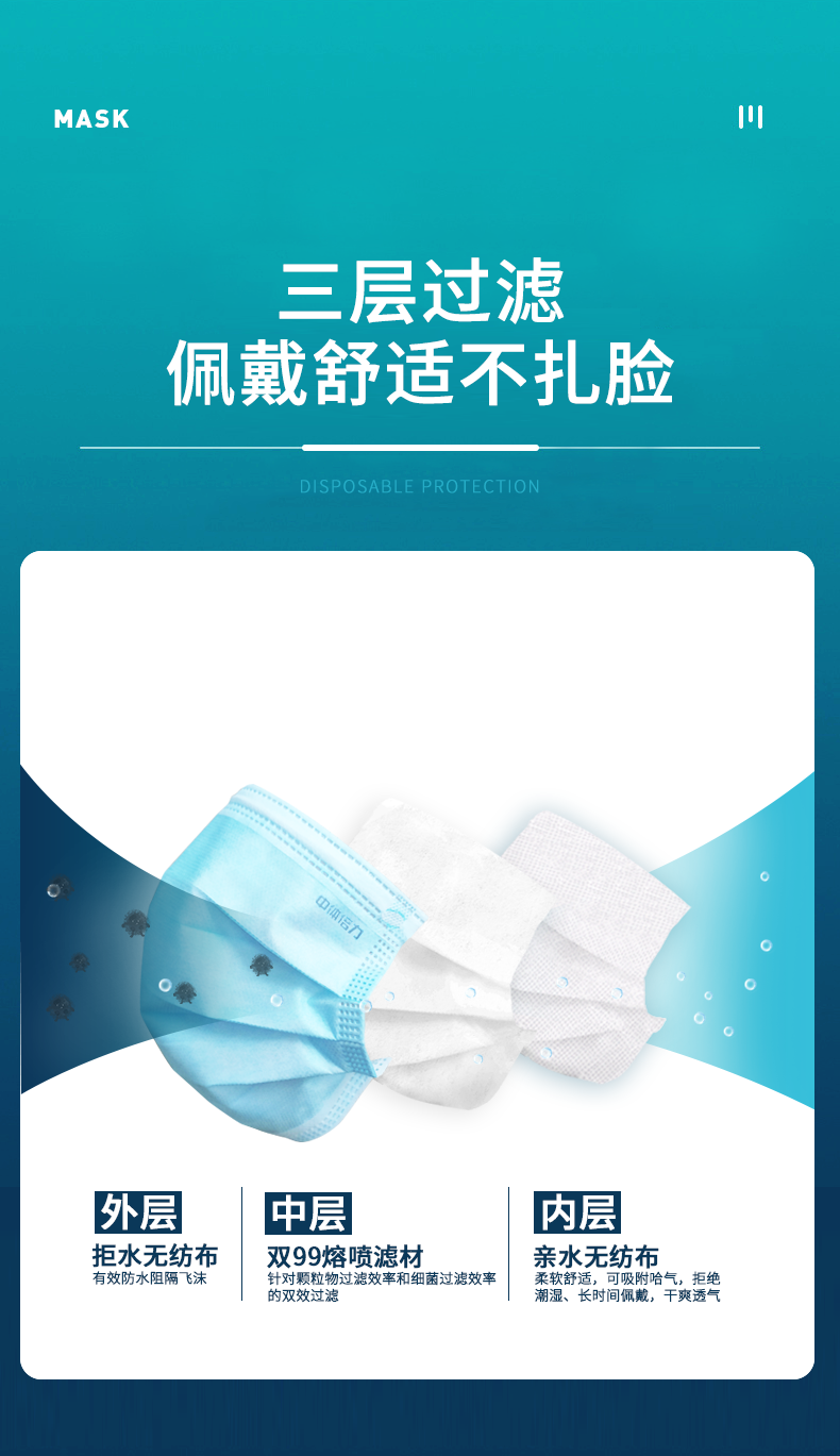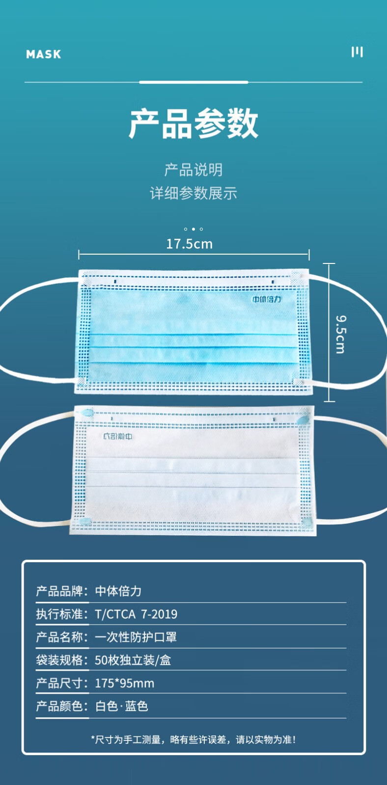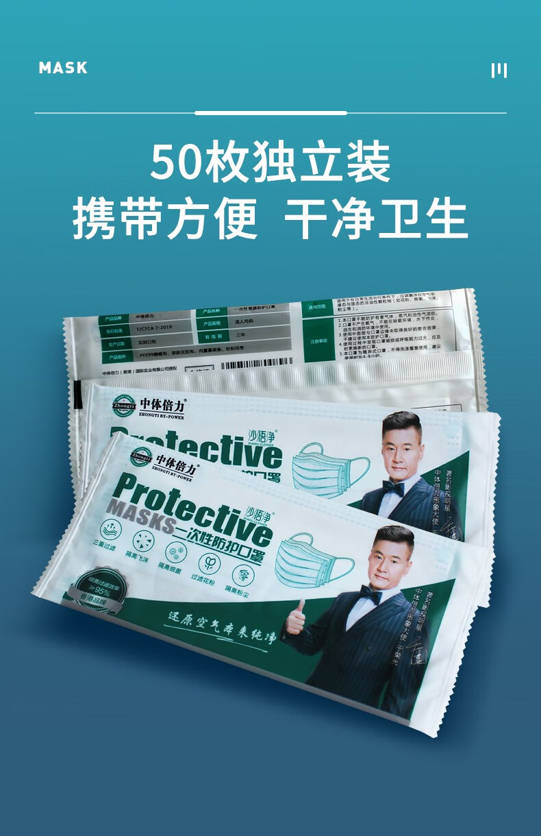 中体倍力 一次性防飞沫熔喷布口罩3层防护透气独立包装男女口罩 H1-50枚-蓝色【独立包装】 单位:盒