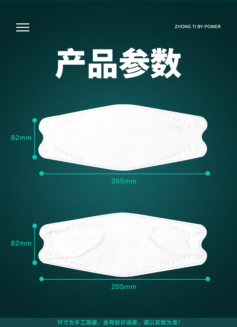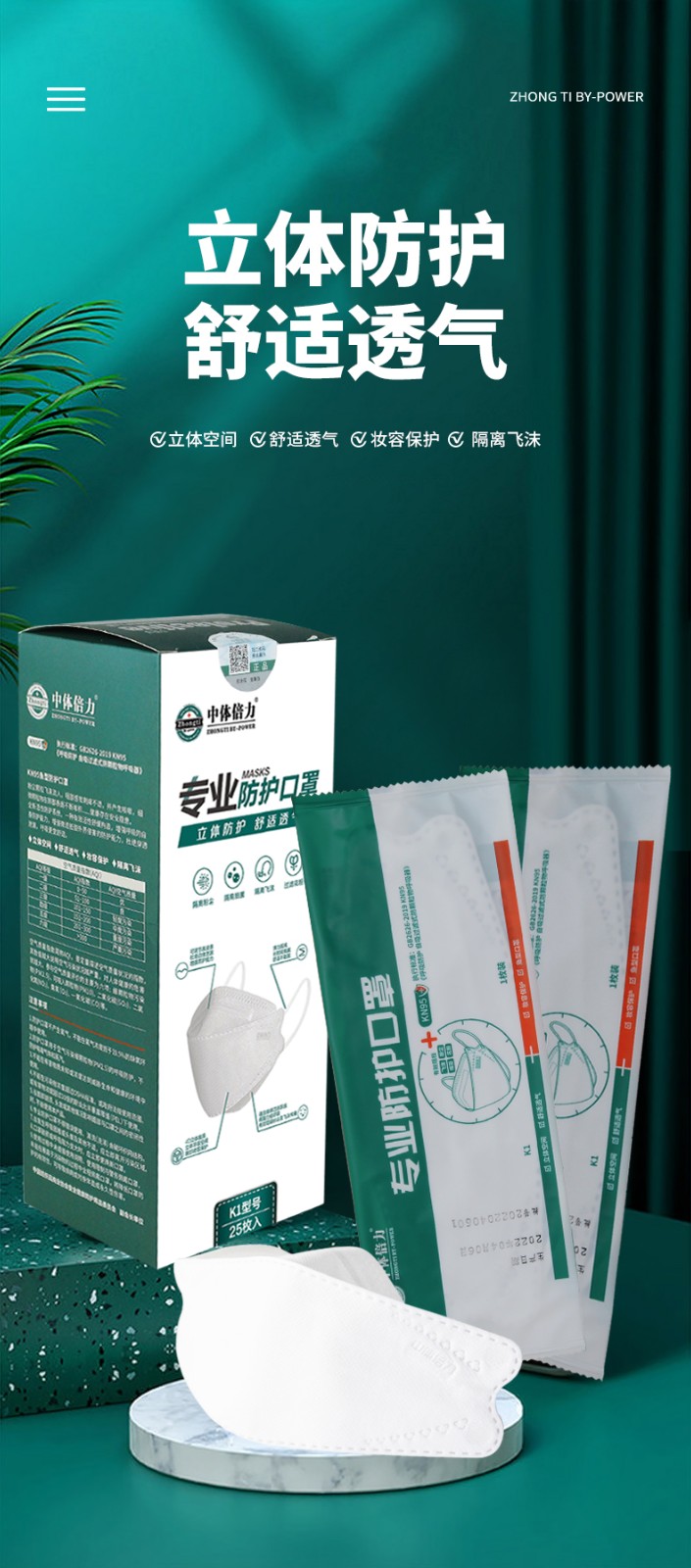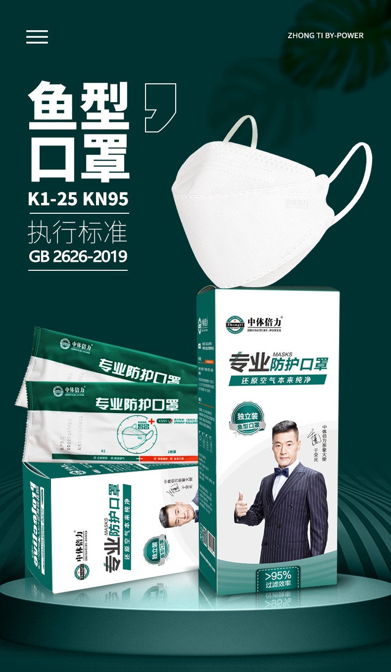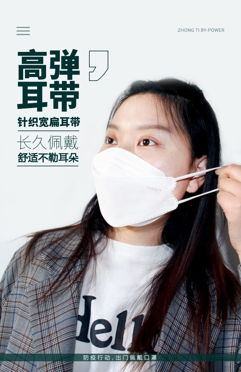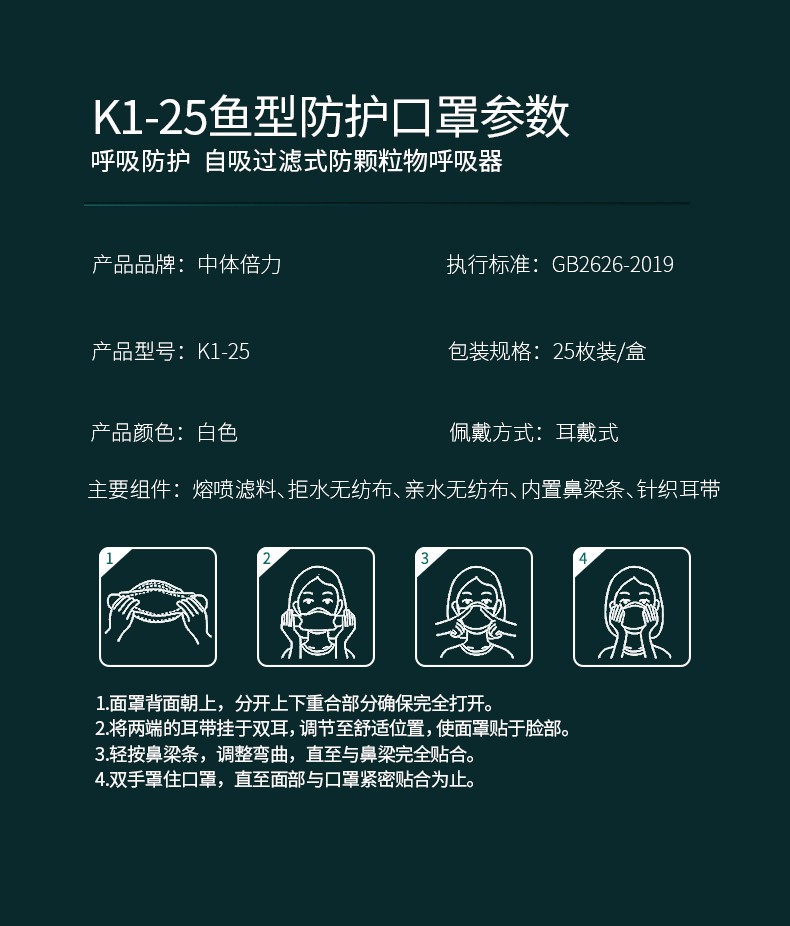中体倍力KN95立体防护柳叶型一次性独立包装鱼型口罩 K1-25白色【25枚装-独立包装】单位:盒