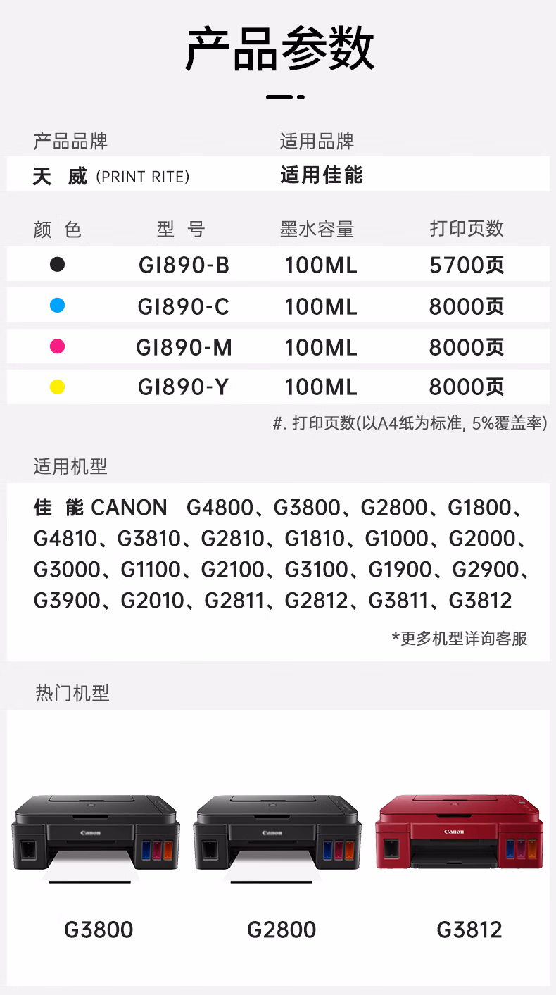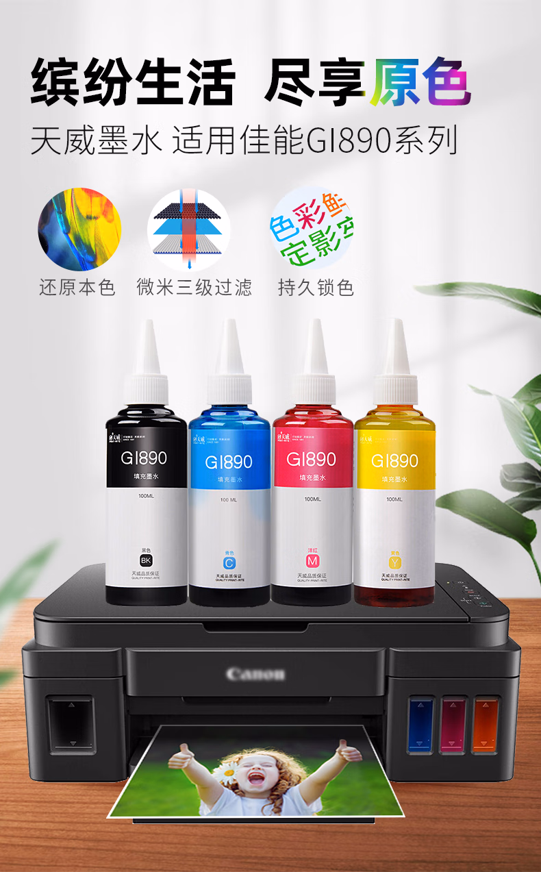 天威 GI-890墨水 四色套装 适用于佳能 G1810 G1000 G2000 G3000 G1100 G2100 G1900 G2900 G3900 打印机墨盒