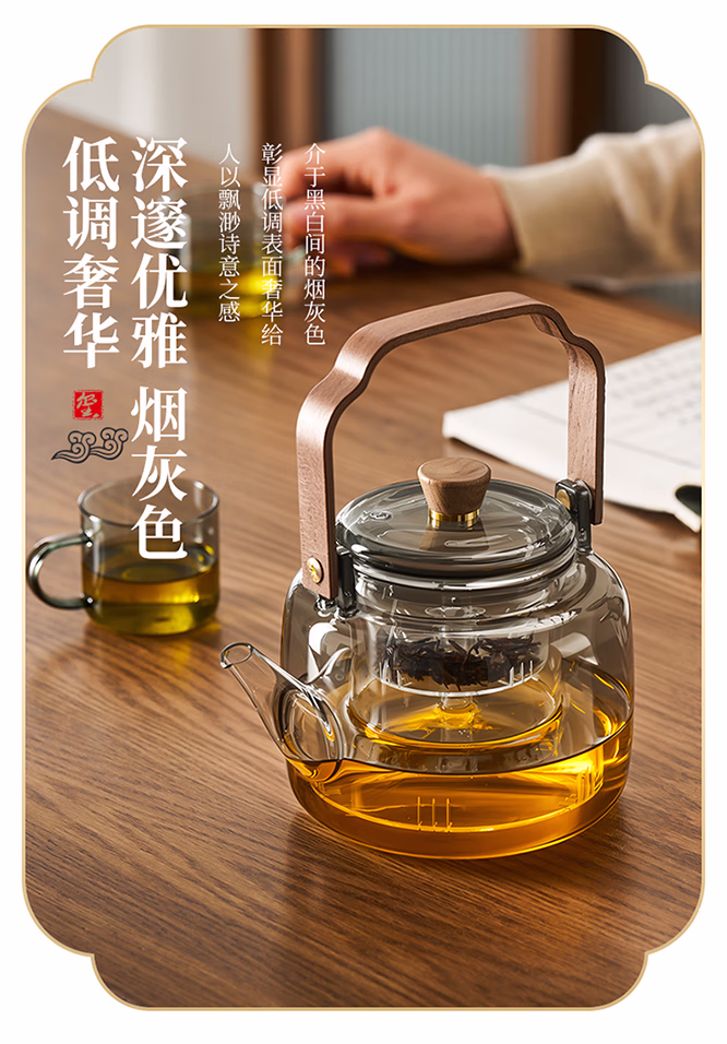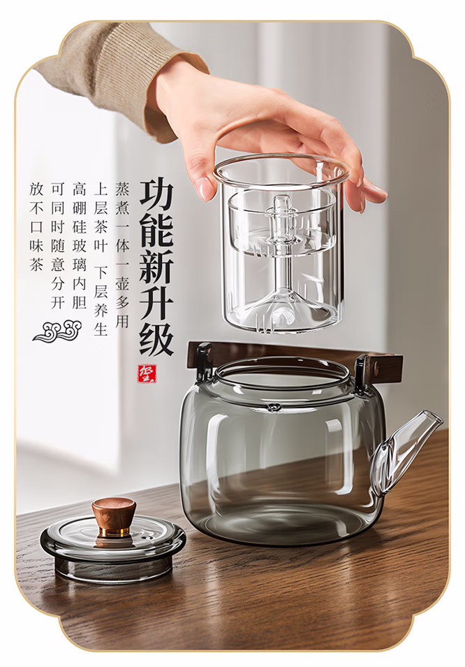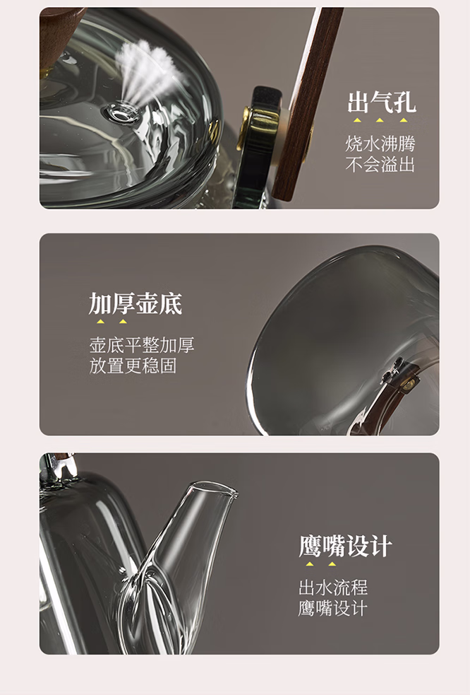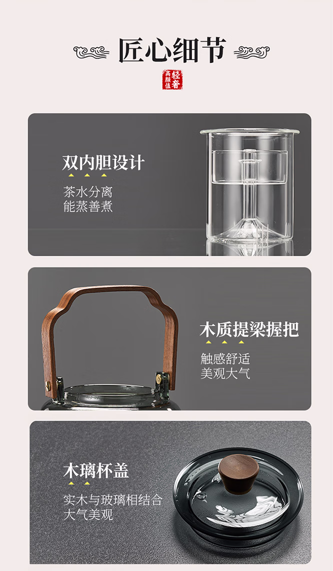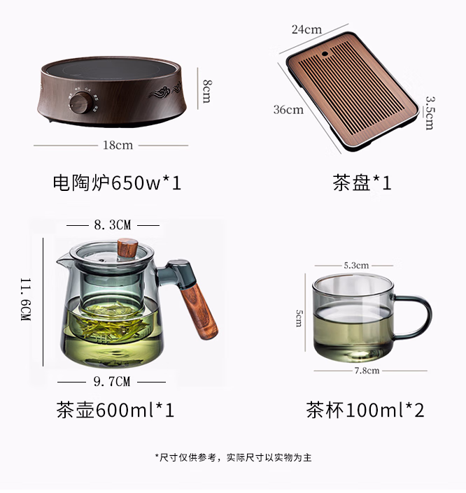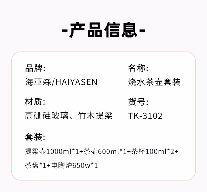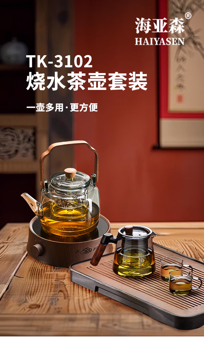 海亚森 TK-3102 烧水茶壶套装1.8L(提梁壶1000ml*1+茶壶600ml*1+茶杯100ml*2+茶盘*1+电陶炉650w*1) 电热壶 1.00 台/套 (计价单位:套) 透明色