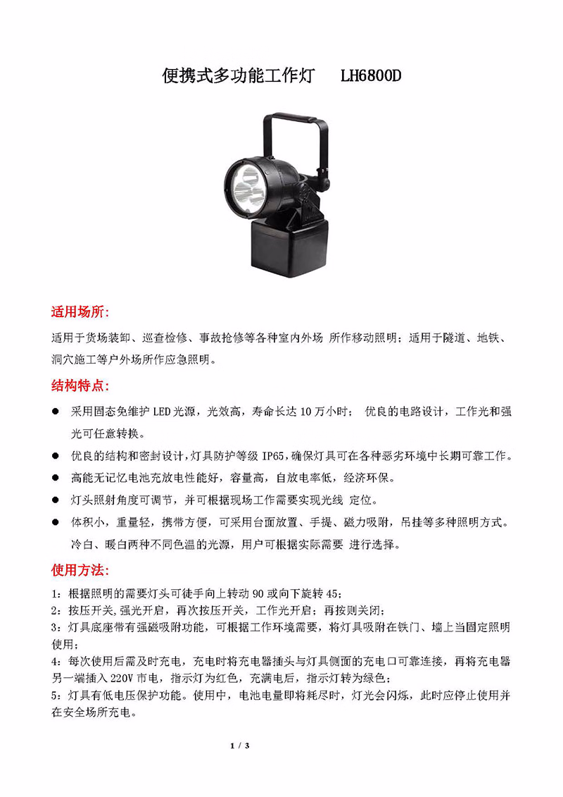领航电器(LHDQ) LH6800D 3*3W IP65 便携式多功能工作灯 手持工作灯 (计价单位:盏) 黑色
