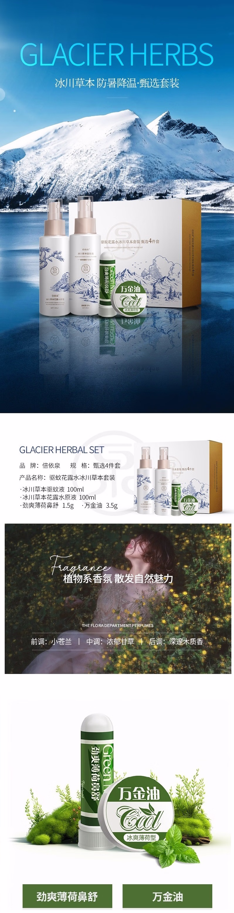 倍依泉 冰川草本套装4件套 (冰川草本驱蚊液100ml+冰川草本花露水原液100ml+劲爽薄荷鼻舒1.5g+万金油3.5g) 花露水 4.00 瓶/套 (计价单位:套) 白色