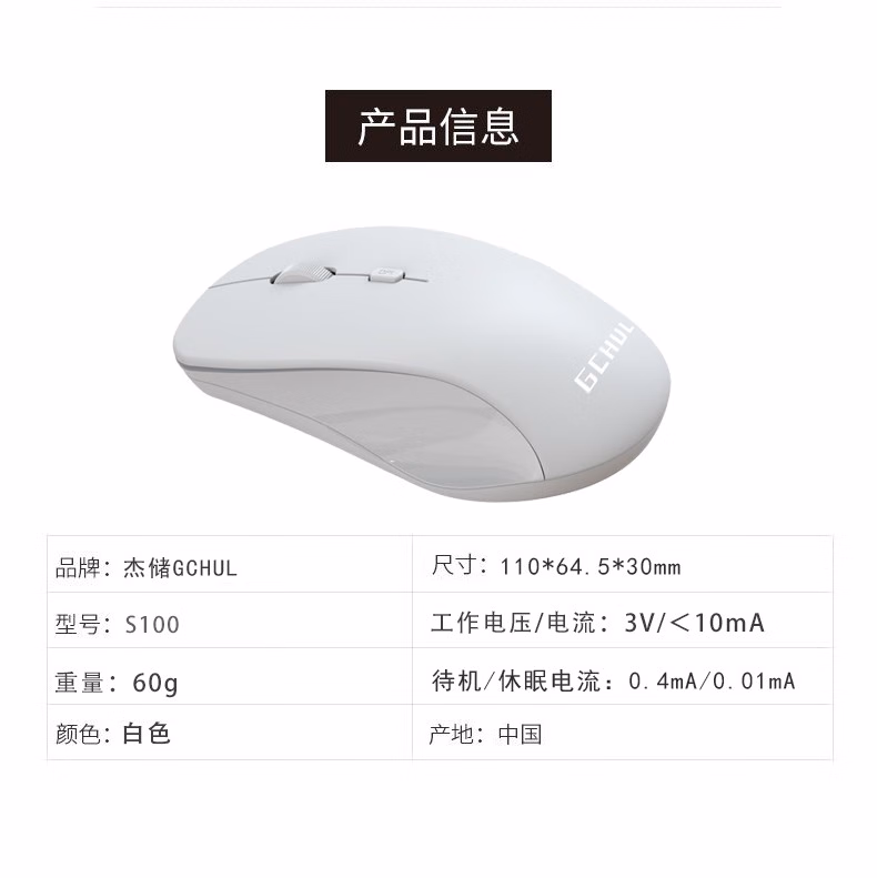 • 商品名称:杰储(GCHUL) S100 可适配电脑手机平板多功能无线 鼠标 (计价单位:个) 白色