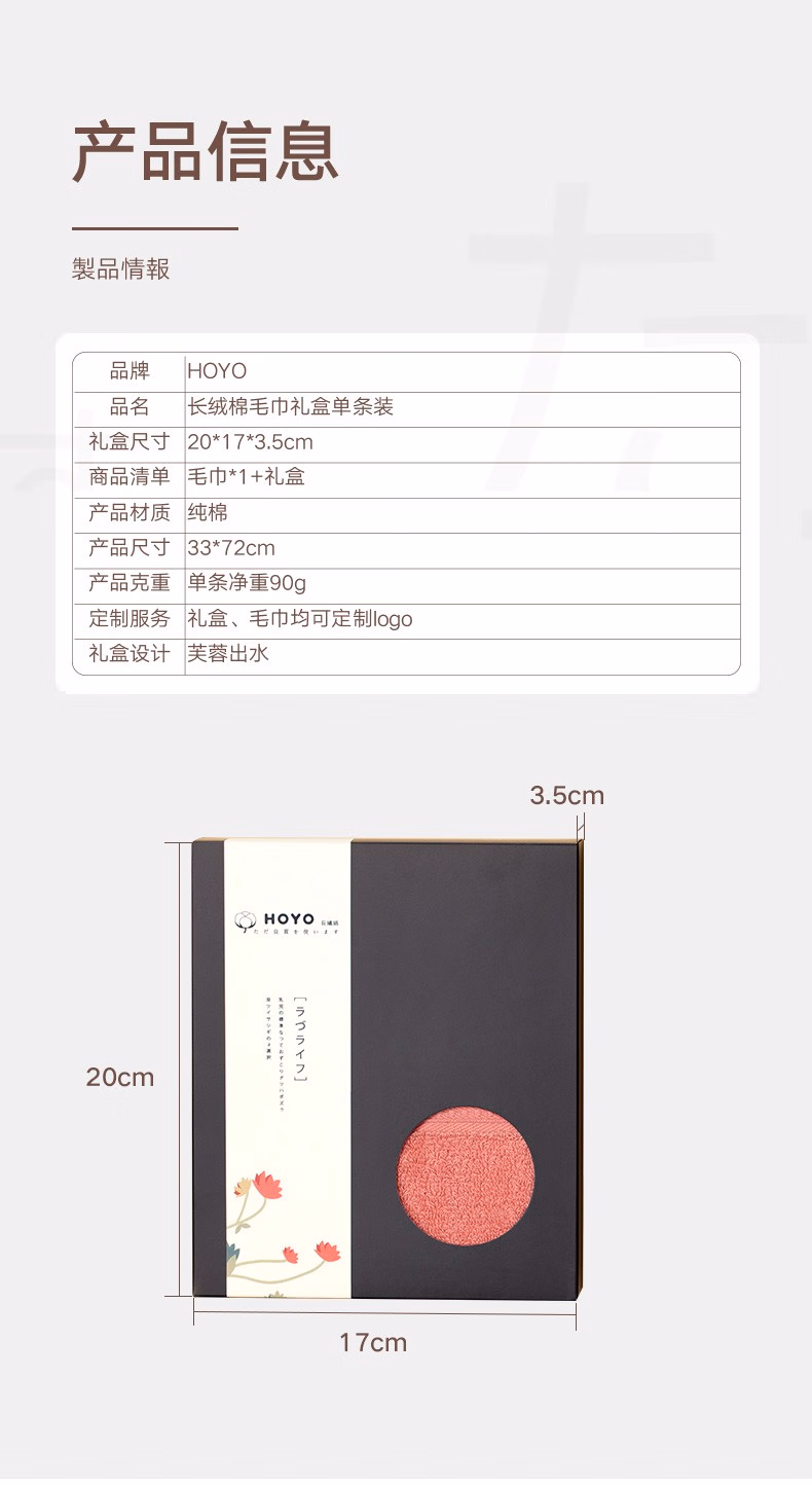 • 商品名称:HOYO日本 母婴级标准纯棉荷花毛巾礼盒单条节日伴手礼福利送礼可定制 深灰 33*72cm