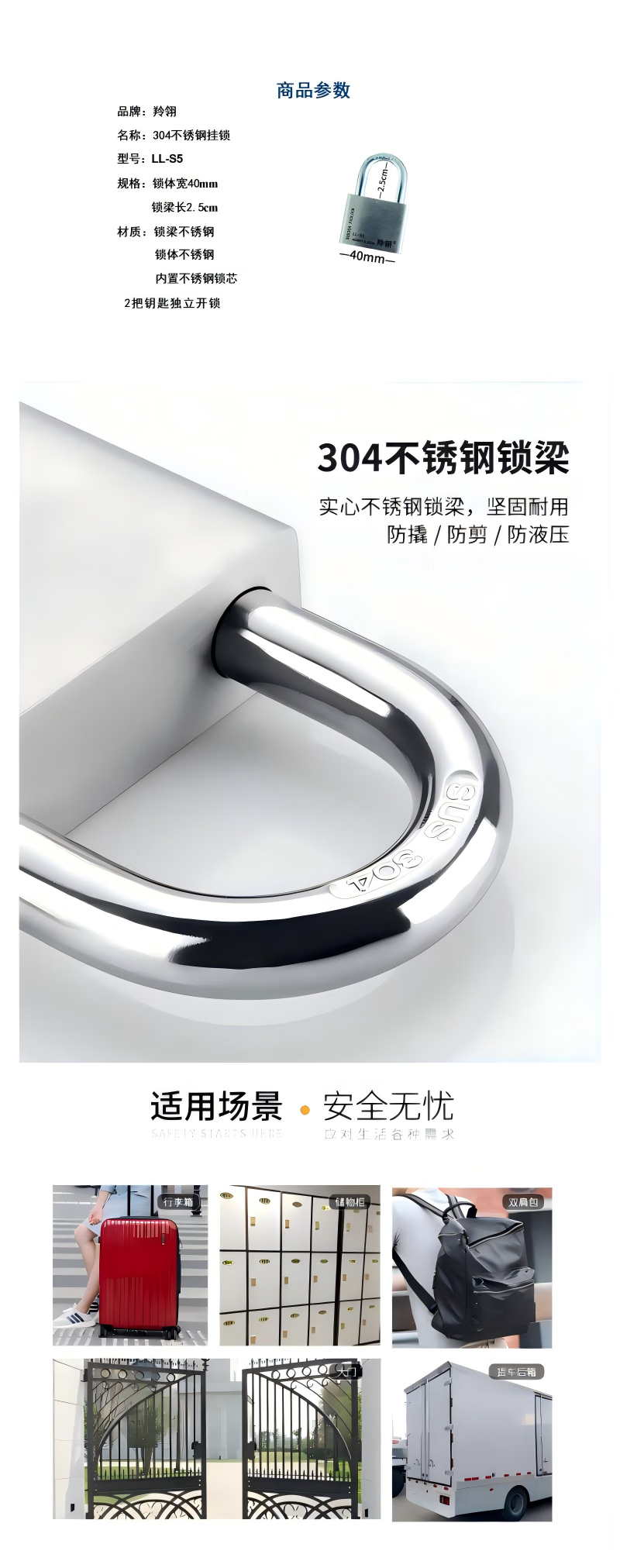 羚翎 LL-S5 40mm锁体 2.5cm梁 不锈钢 挂锁 (计价单位:个) 银色