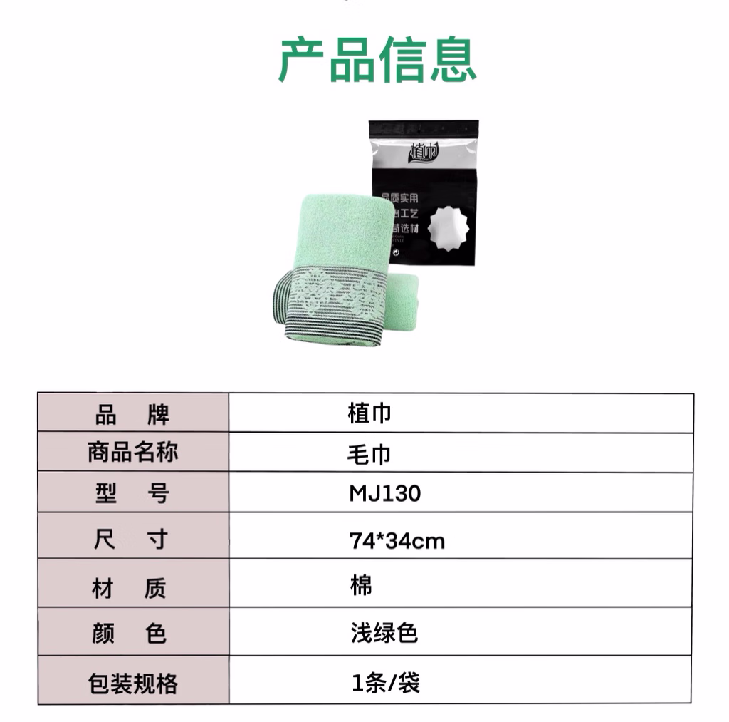 • 商品名称:植巾MJ130 74*34cm 棉 毛巾 (计价单位:条) 浅绿色