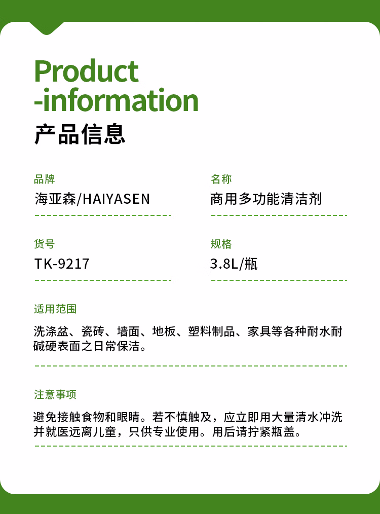 海亚森 3.8L TK-9217 商用多功能清洁剂 清洁药剂 1.00 瓶/桶 (计价单位:桶) 白色