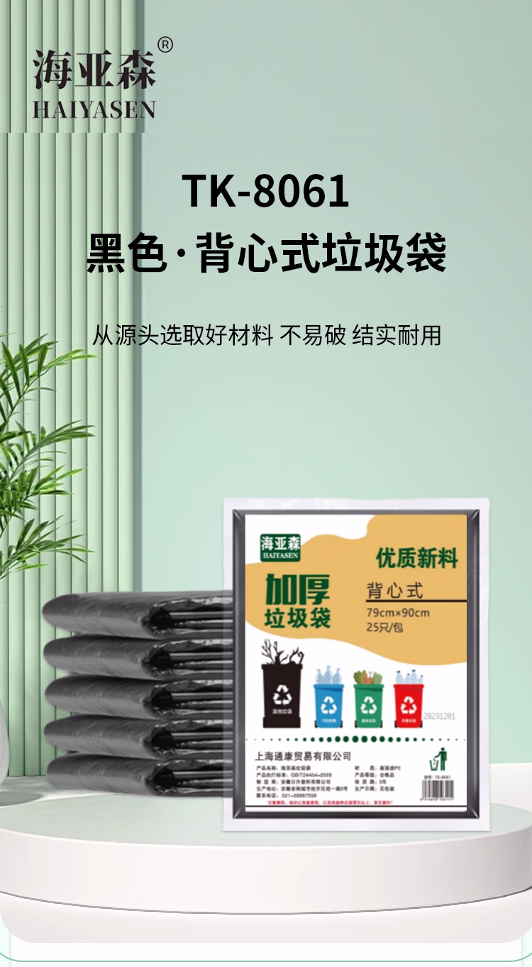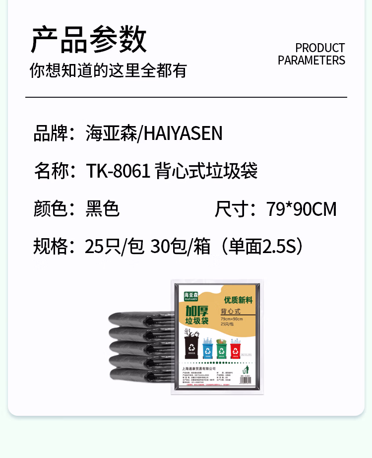 海亚森 TK-8061 79*90cm 厚度单面2.5S 25只/包 背心式 垃圾袋 (计价单位:包) 黑色 2包起订