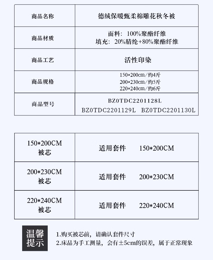 • 商品名称:伊伊爱 德绒保暖甄柔棉雕花秋冬被 德绒本白 150*200cm/BZ0TDC2201128L