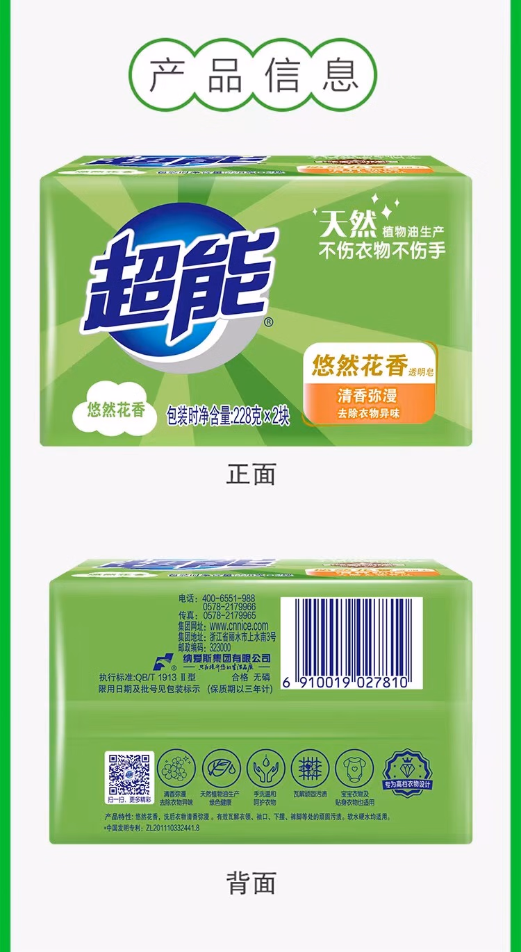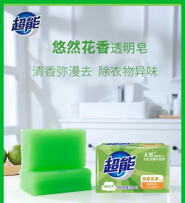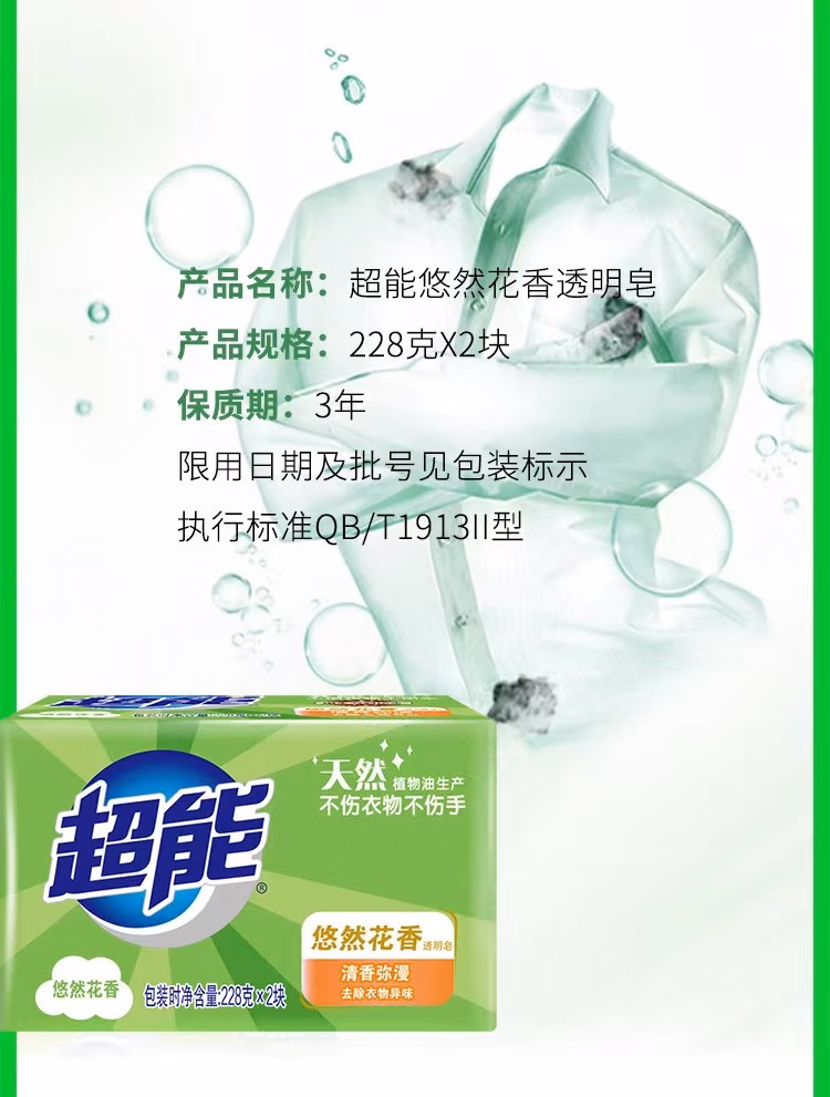 • 商品名称:超能228g*2悠然花香透明皂(特渠) 228g*2