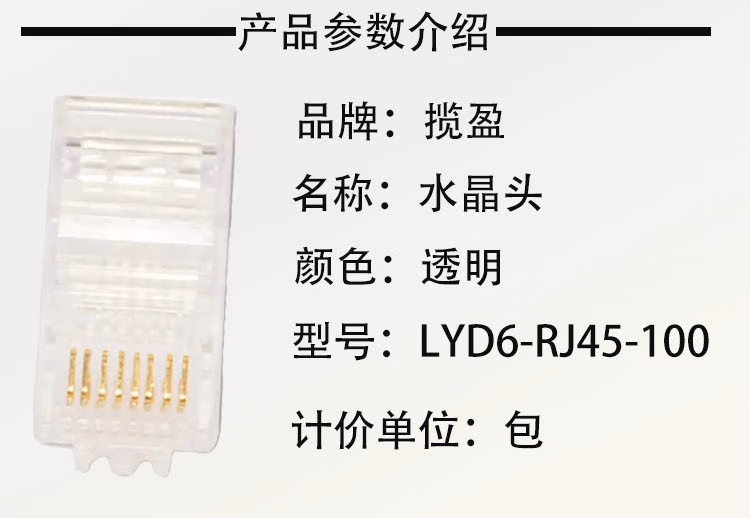 • 商品名称:揽盈 LYD6-RJ45-100 六类 水晶头 100个/包 (计价单位:包) 透明