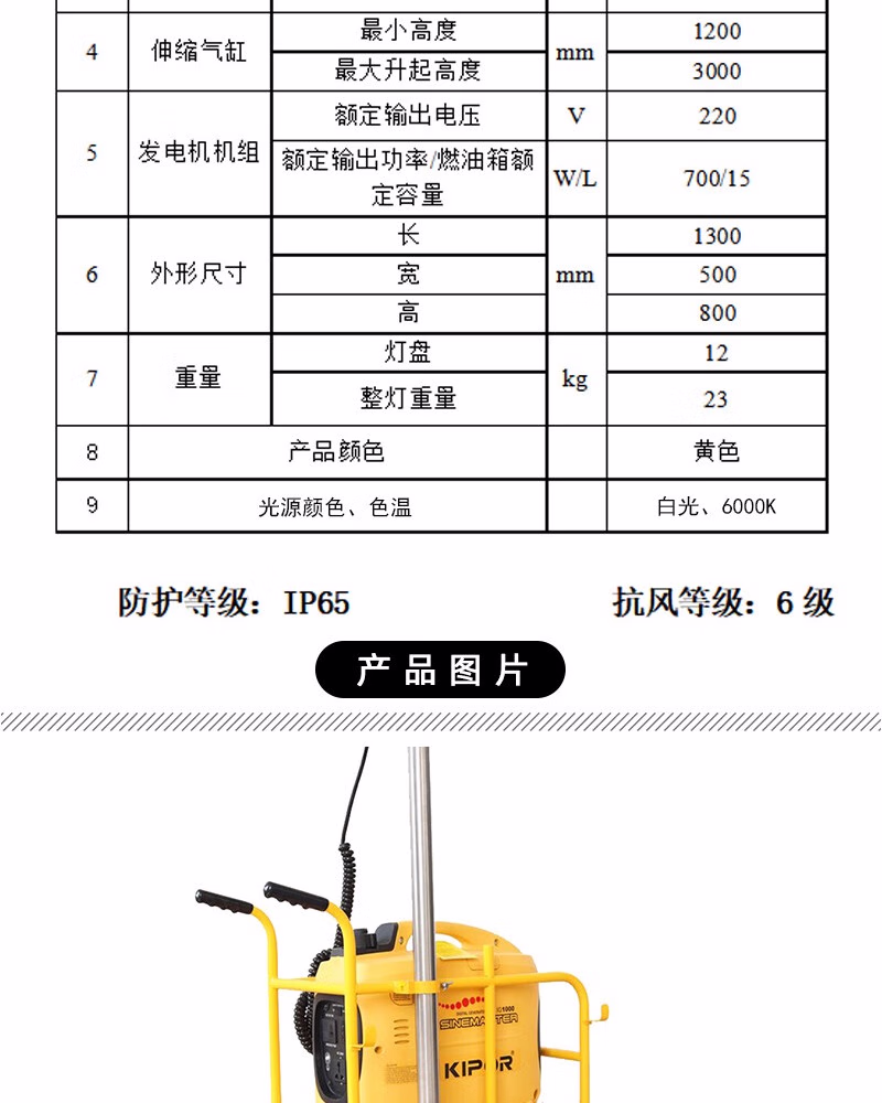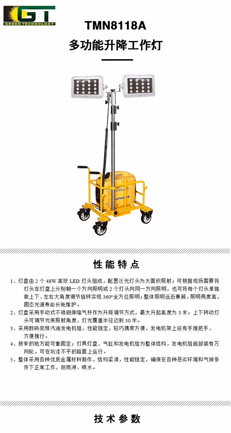 吉特(GT) TMN8118A,2*48W,IP65,电压:220V,白光,6000K,LED 多功能升降工作灯 1.00 台/套 (计价单位:套) 黄色