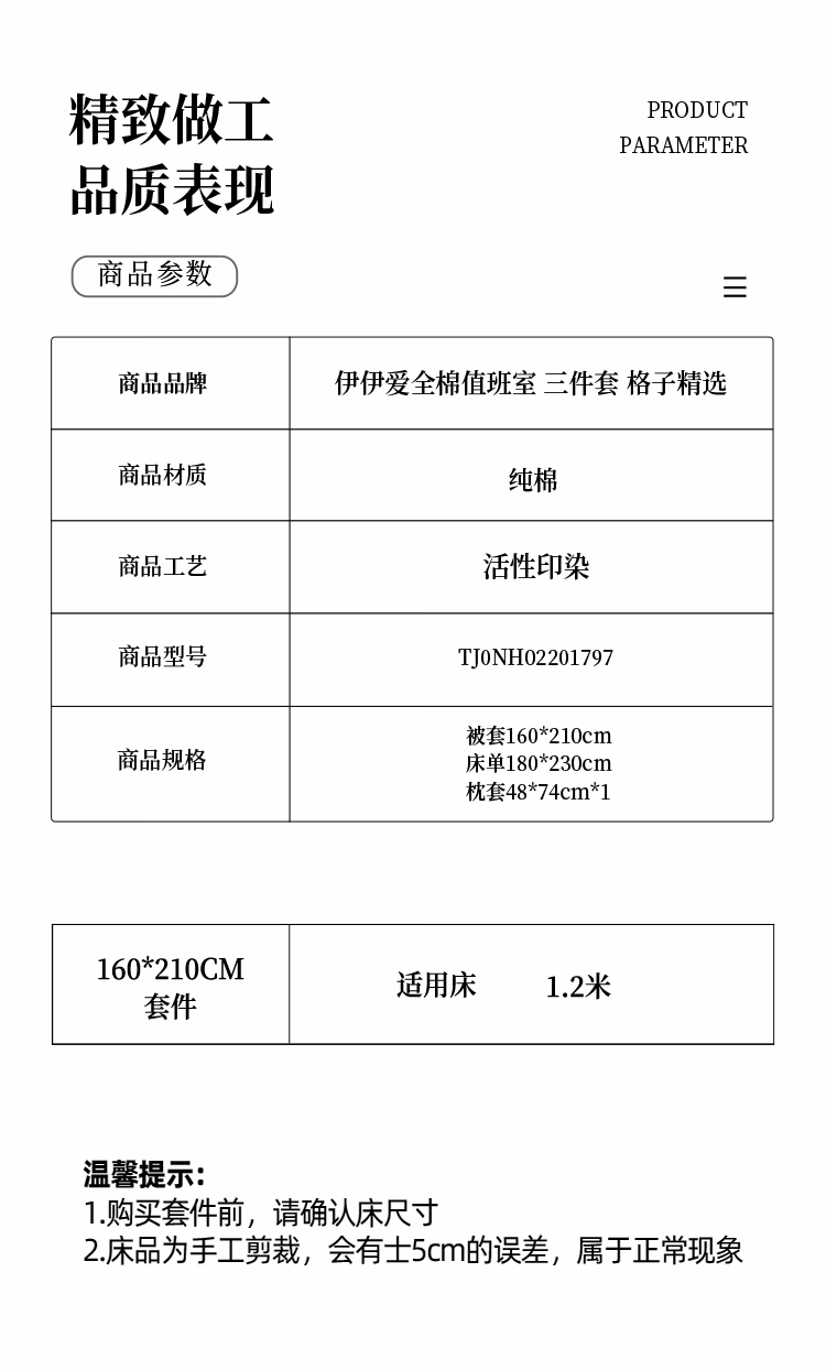 • 商品名称:伊伊爱 全棉值班室床品格子精选三件套 格子精选/TJ0NH02201797 160*210cm