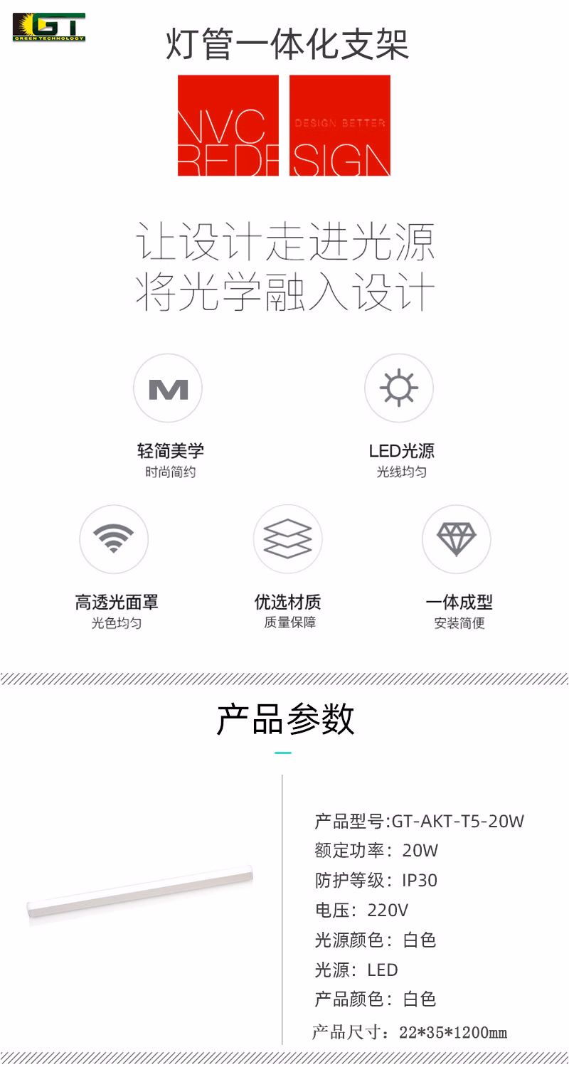 吉特(GT) GT-AKT-T5-20W 20W IP30 电压220V 白光 LED 灯管一体化支架 (计价单位:个) 白色