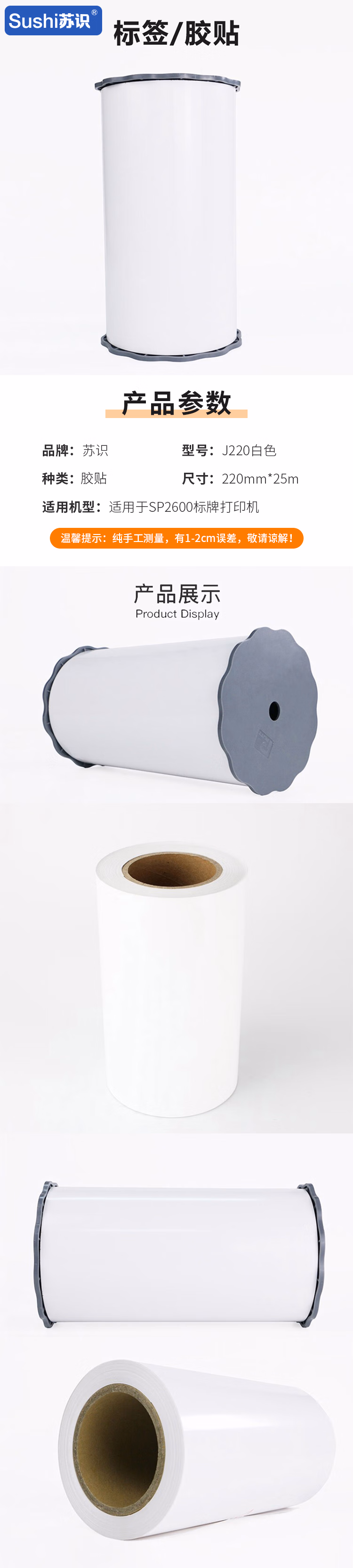 苏识 J220白色 适用SP2600标牌打印机 胶贴 1.00 卷/盒 (计价单位:盒) 白色