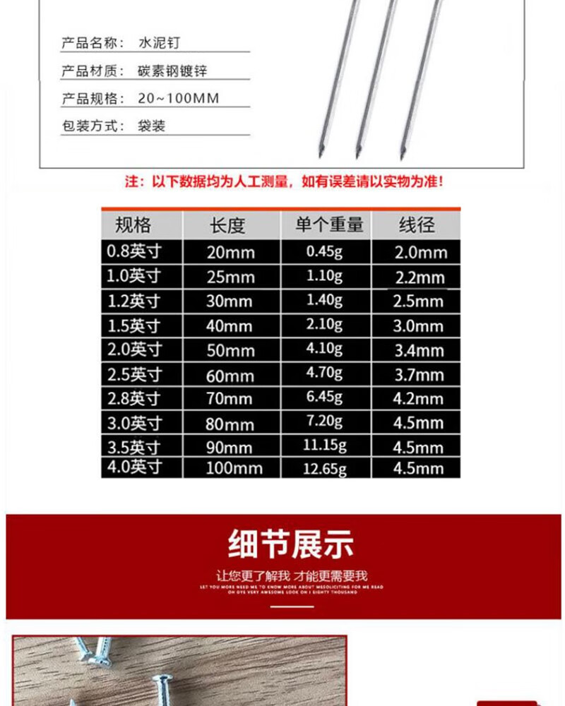 晟泰邦 水泥钉钢钉墙钉小铁钉固定挂钩画相框墙壁木工钉国标 25mm200g约205个一包 单位:包 5包起订