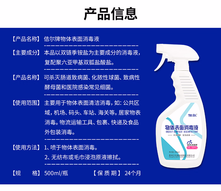 • 商品名称:佶尔牌物体表面消毒液500ml/瓶双链季铵盐聚六亚甲基双胍环境消毒液