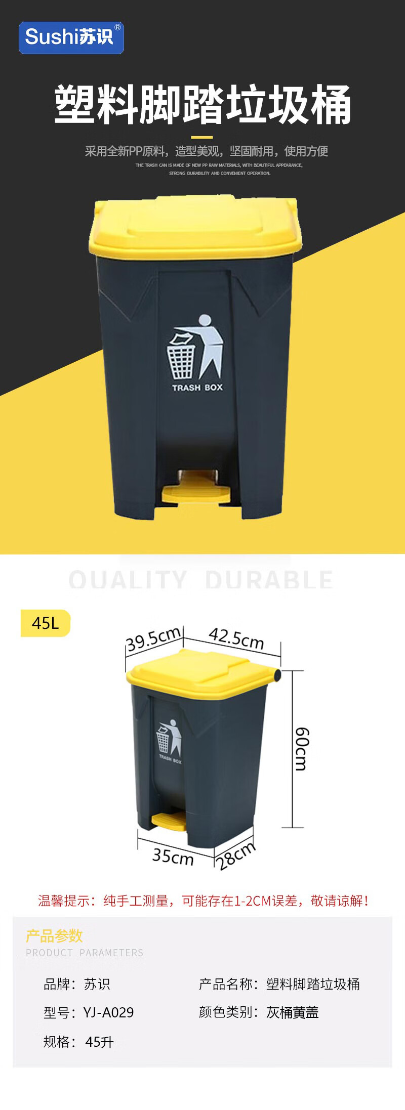 苏识 YJ-A029 45升 塑料脚踏垃圾桶 (计价单位:个) 灰桶黄盖