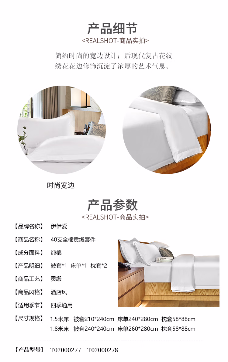 • 商品名称:伊伊爱贡缎纯棉高密五星宾馆酒店四件套 白色 210*240cm/T02000277