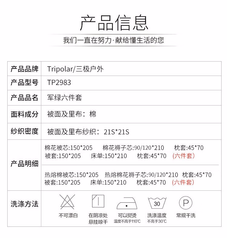 三极户外(Tri-Polar) TP2983 三件套+热熔棉被芯+热熔棉褥子芯送褥子套+枕芯 六件套 (计价单位:套) 军绿色