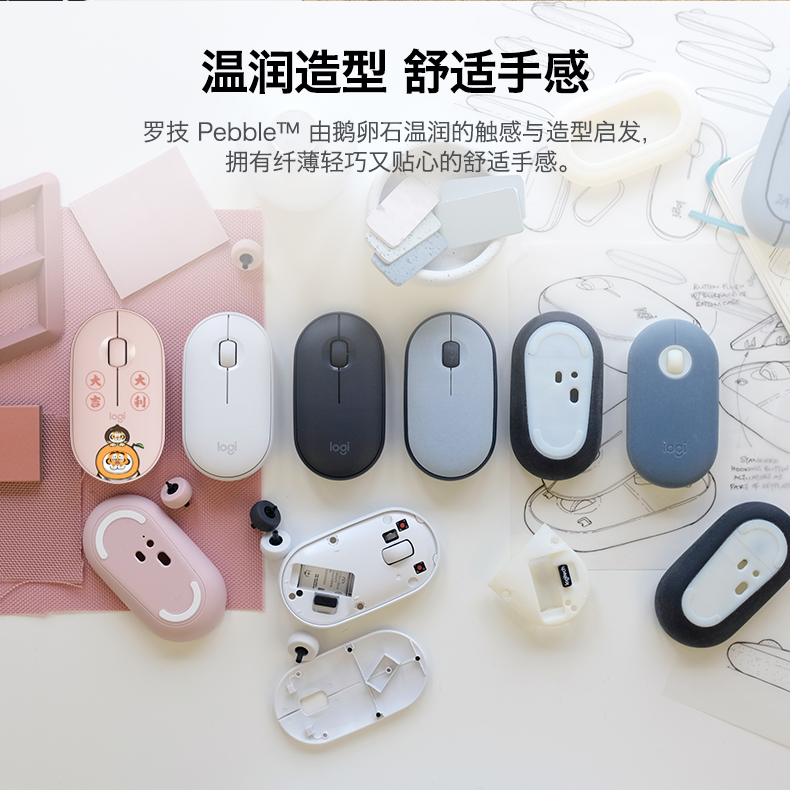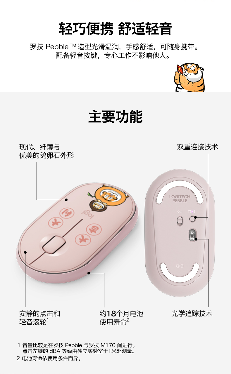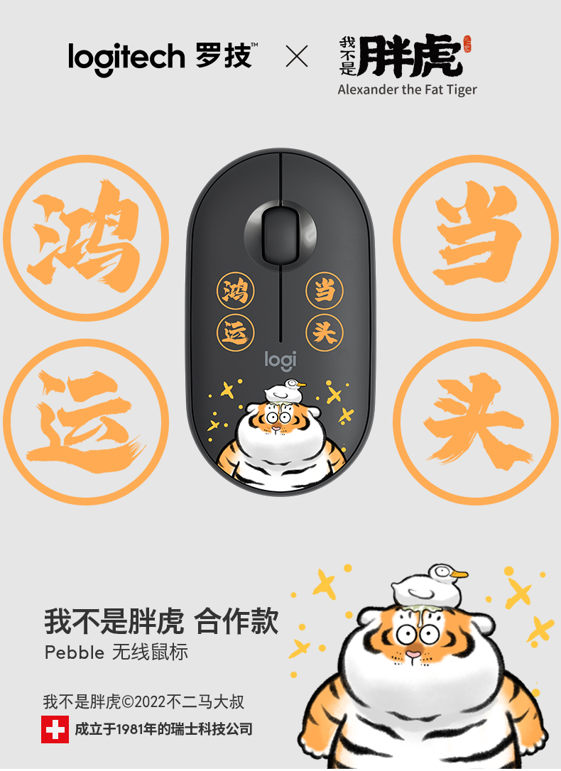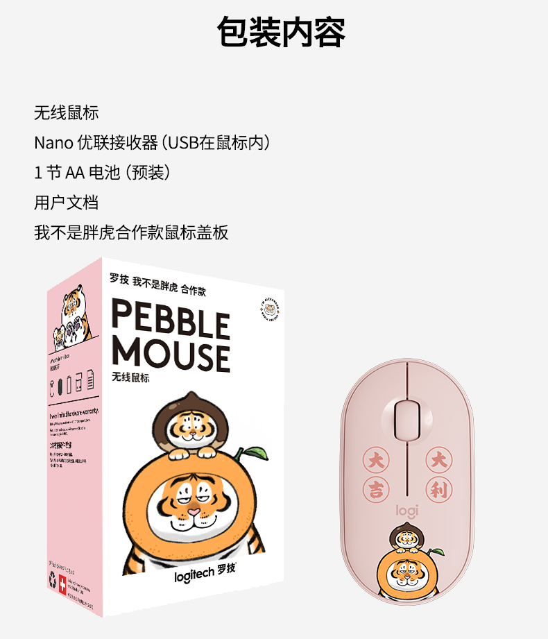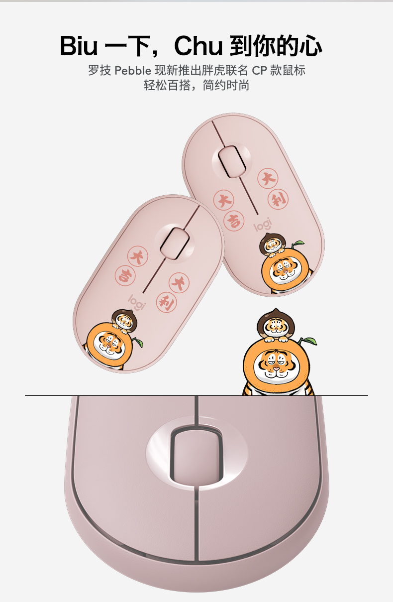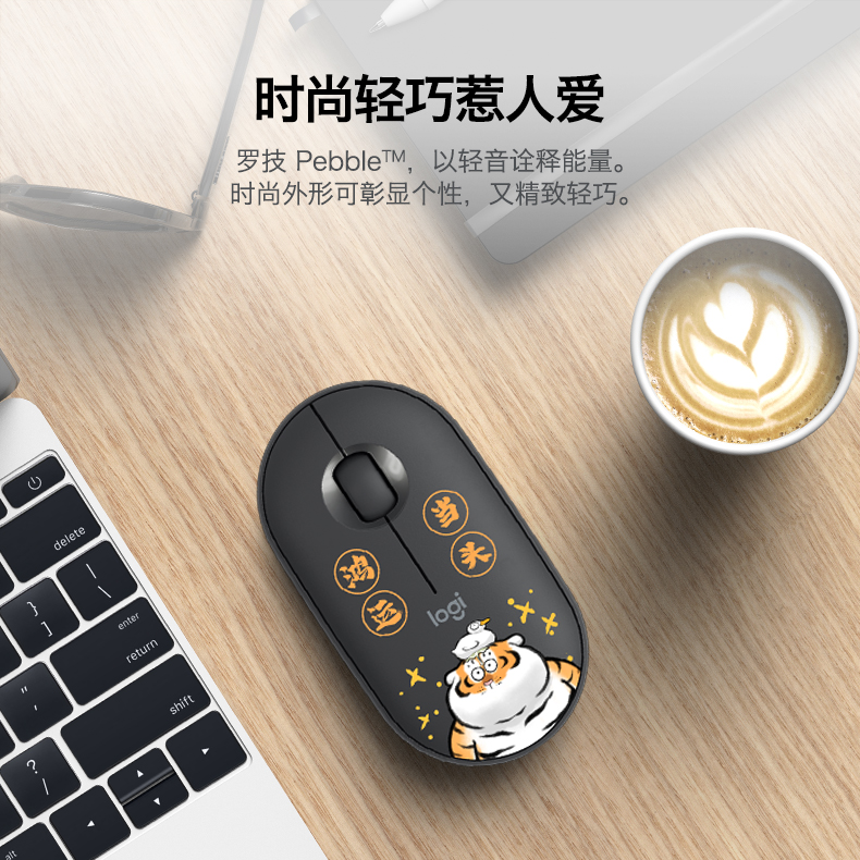罗技(Logitech) Pebble鹅卵石轻薄型轻音办公鼠标 蓝牙无线双模 时尚便携可爱 少女馆 Pebble胖虎黑+鼠标垫 单位:个