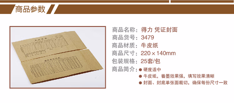 得力(deli) 3479 220*140mm 横板 牛皮纸 记账凭证封面 25.00 个/包 (计价单位:包)