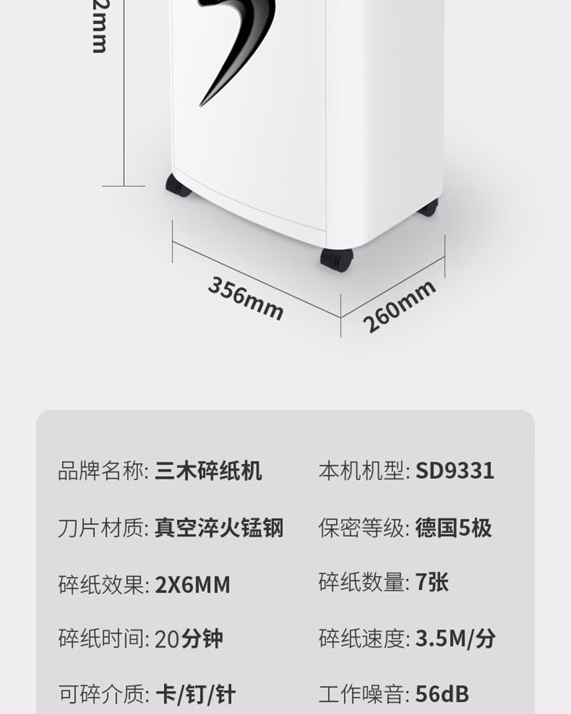三木(SUNWOOD) SD9331 20L 2*6mm 碎纸机 (计价单位:台) 白色