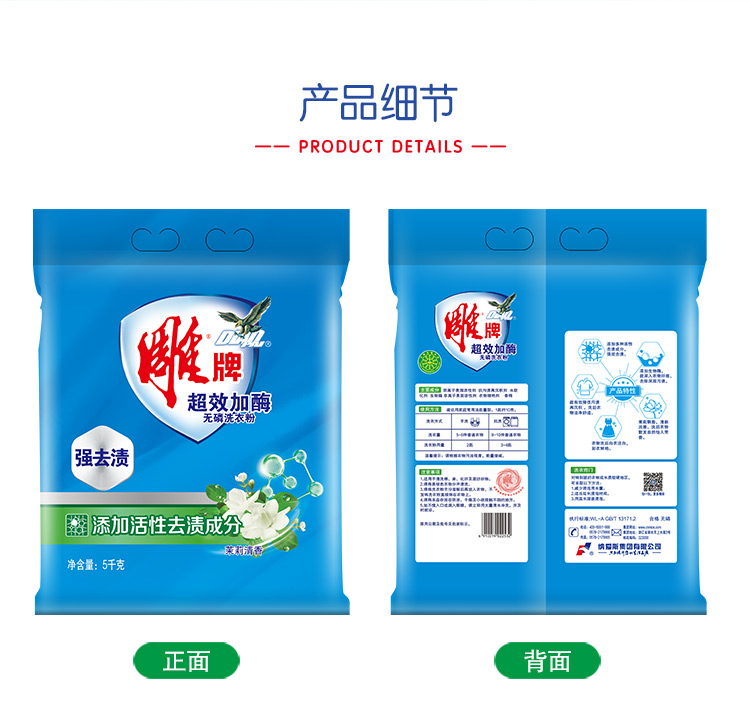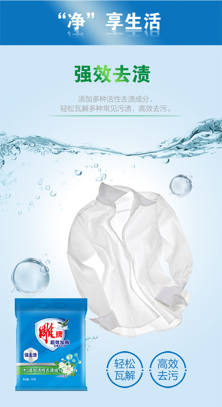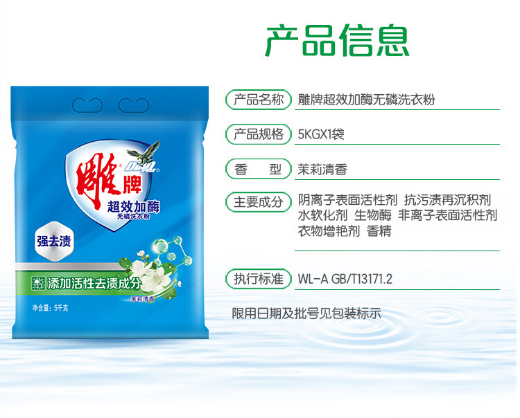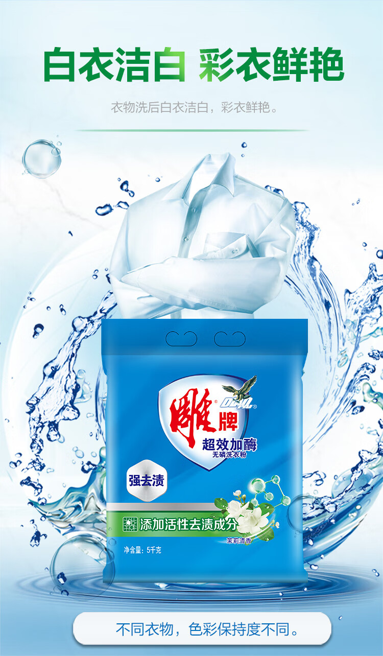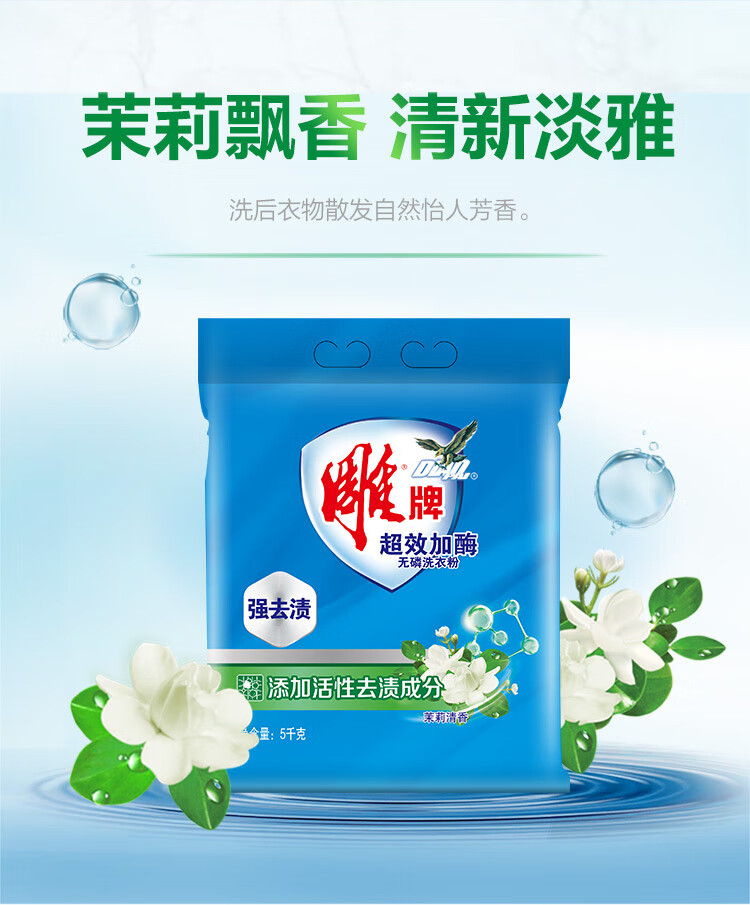 雕牌 超效加酶洗衣粉5kg 茉莉清香 强效去渍 添加生物酶 深层去污 白衣洁白 彩衣鲜艳 保持柔软 单位:包