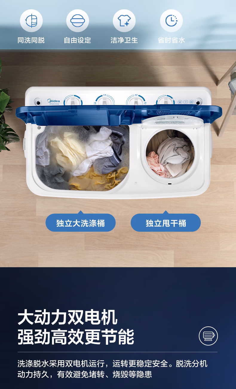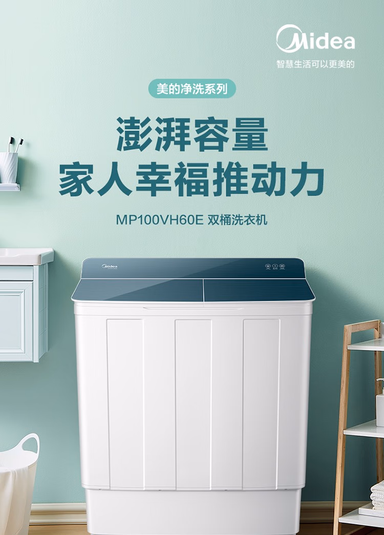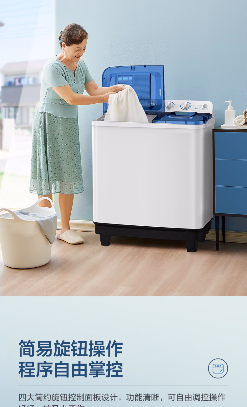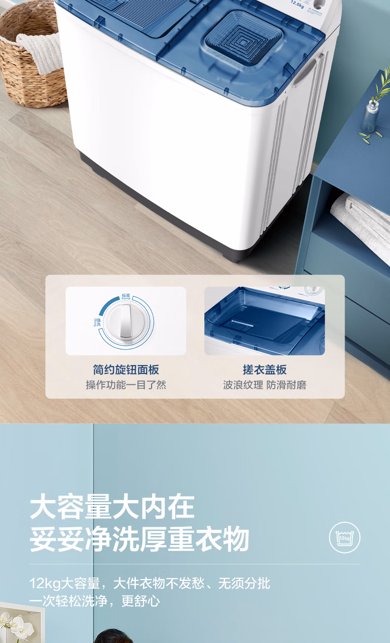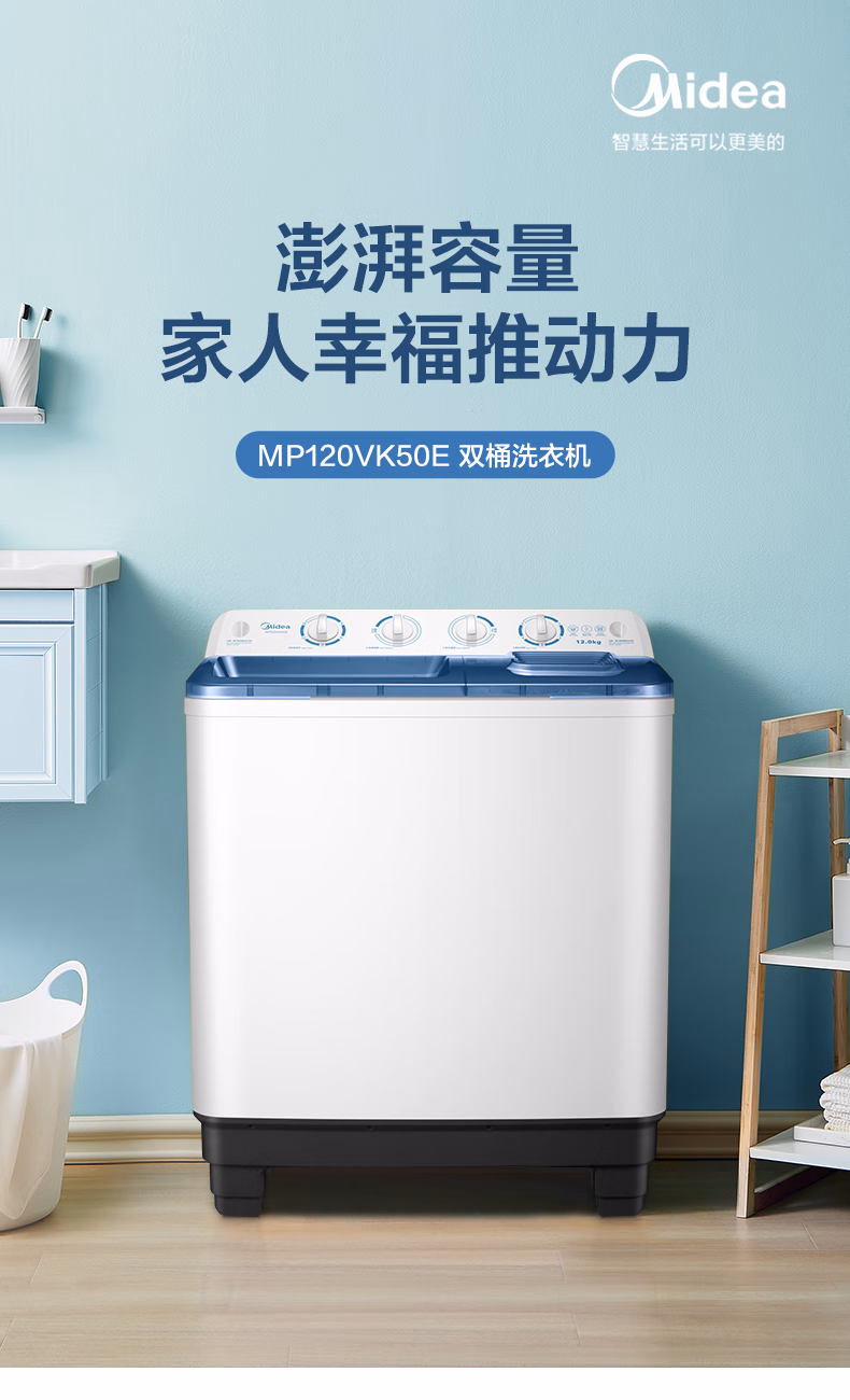 美的(Midea)洗衣机双缸双桶半自动 家用大容量 洗脱分离品质电机强劲动力省水省电以旧换新 【12公斤大容量强动力】MP120VK50E