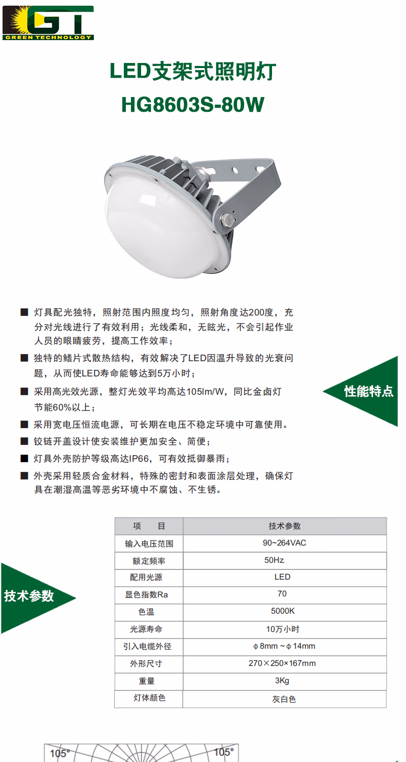 吉特(GT) HG8603S-80W 80W IP66 电压90~264VAC LED 色温5000K 灰白色 LED支架式照明灯 1.00 个/盏 (计价单位:盏) 灰白色