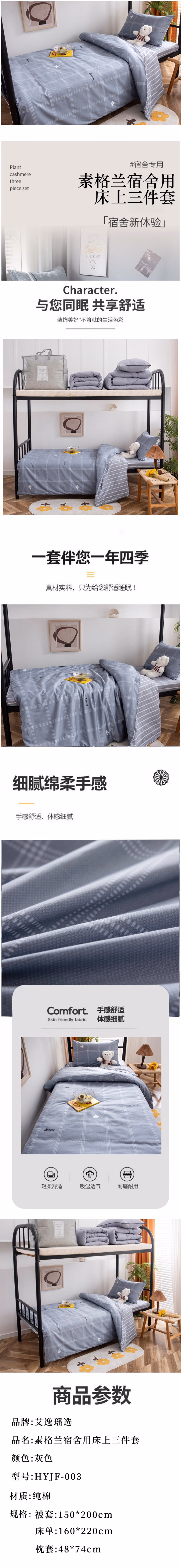 艾逸瑶选 HYJF-003 被套:150*200cm床单:160*220cm枕套:48*74cm 选素格兰宿舍用床上三件套 (计价单位:套) 灰色